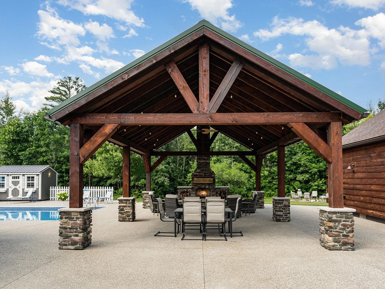 A spacious outdoor pavilion with an open timber frame and pitched roof, supported by sturdy wooden beams atop stone columns. Under the shelter, a large rectangular dining table surrounded by cushioned chairs creates a welcoming gathering space. A stone fireplace serves as a focal point at the far end, perfect for outdoor entertaining. The ground is finished in light textured concrete, and the pavilion sits adjacent to a swimming pool with a white picket fence visible nearby. Surrounding the area are lush green trees, framing the space with a natural, tranquil atmosphere. A small shed adds functionality in the background.