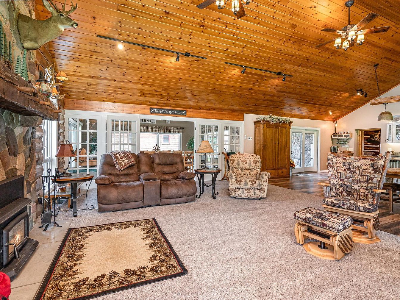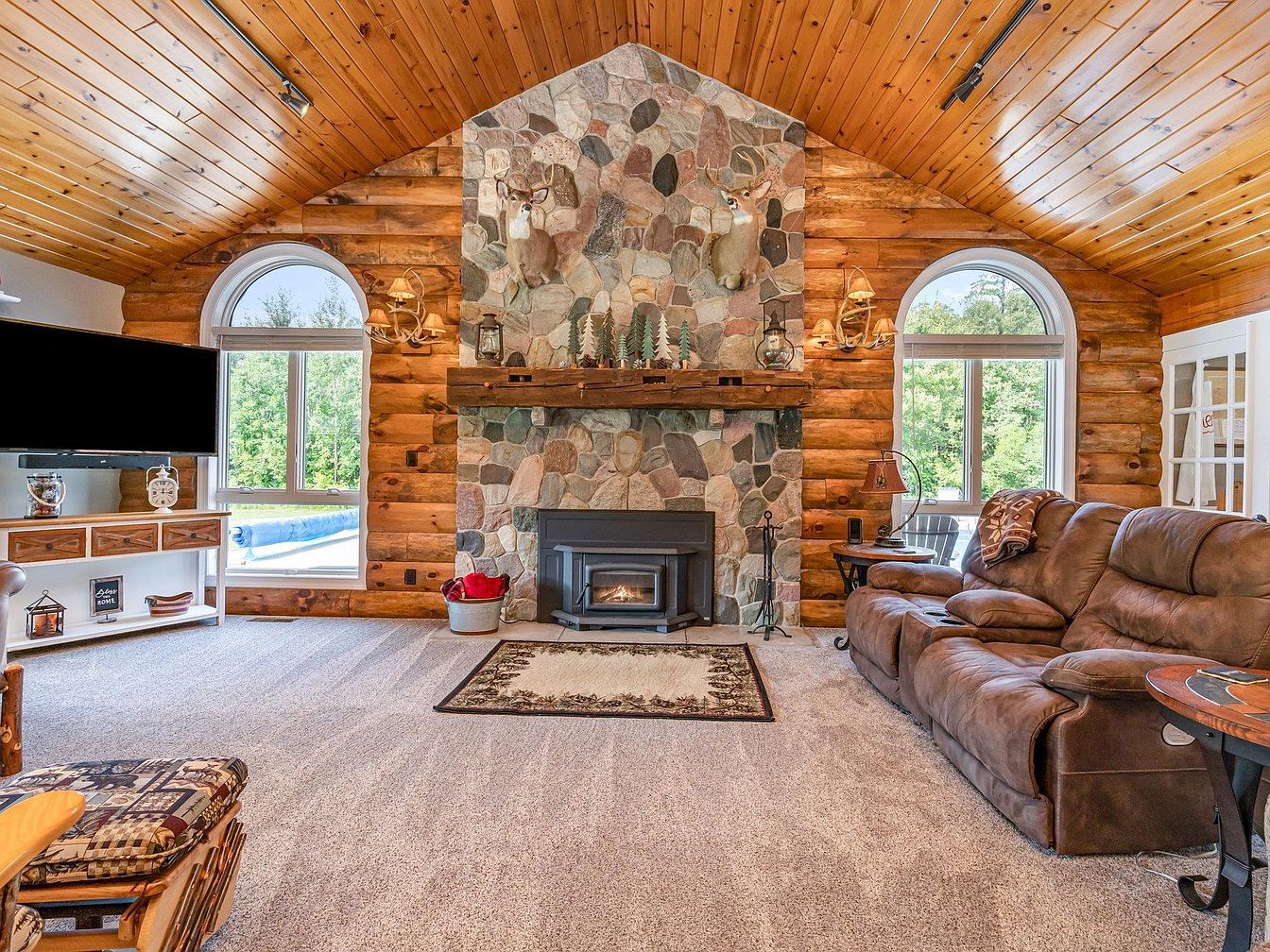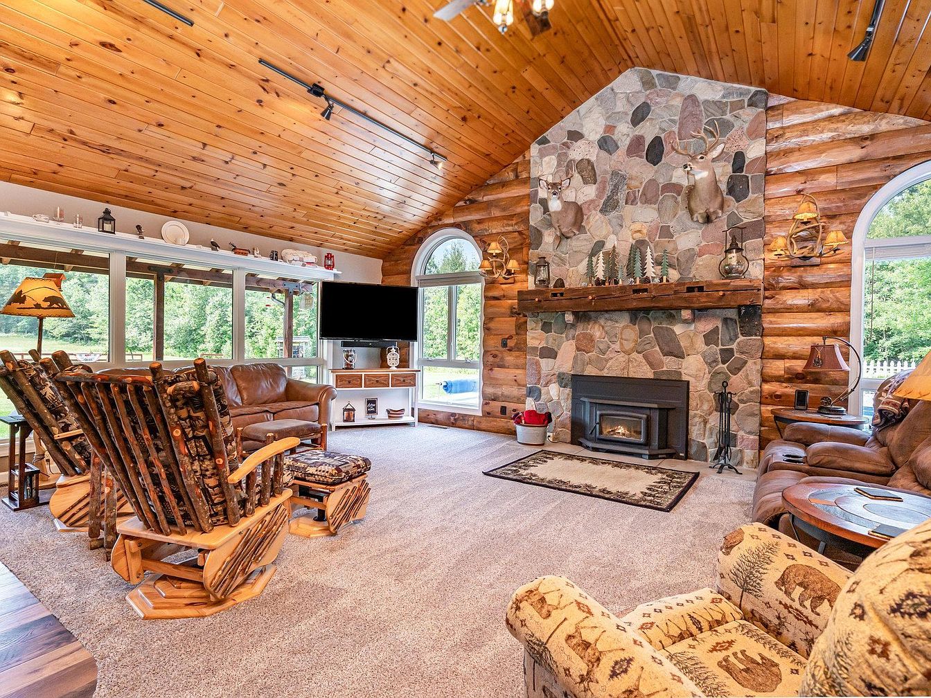 Warm, rustic space featuring log walls and a vaulted tongue-and-groove wood ceiling. A stone fireplace with a wood stove insert and a prominent mantel serves as the centerpiece, adorned with a deer mount, antler decor, and small decorative items. Two large arched windows flank the fireplace, filling the room with natural light and offering views of greenery outside. Plush brown reclining sofas and a patterned armchair provide comfortable seating. The carpet is a soft, neutral beige, and there’s a small area rug in front of the fireplace. Accents include a white media console and side tables, contributing to the cozy lodge ambiance.