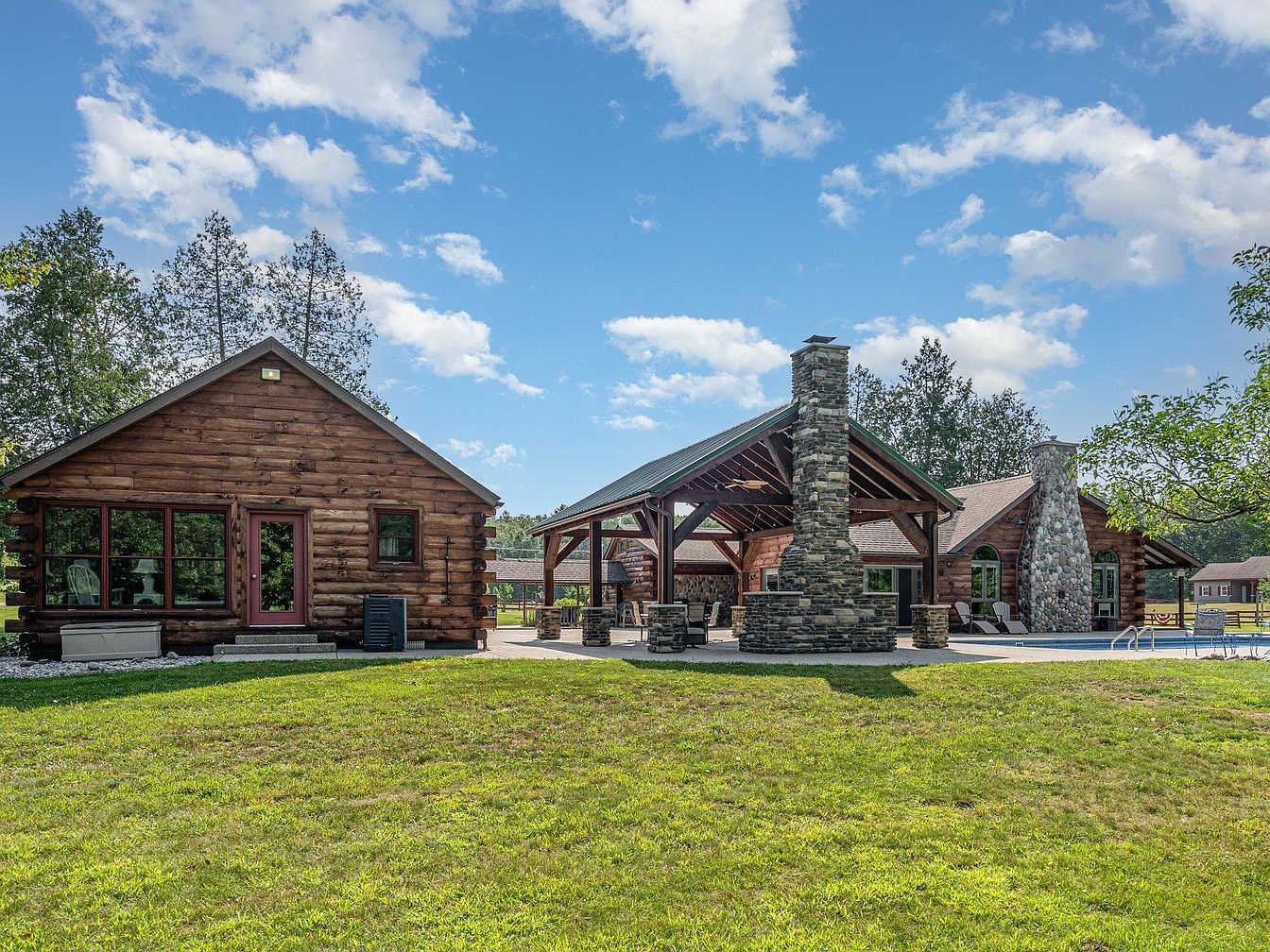 Expansive lawn leads to a rustic log home with a large open-air patio at its center. The patio is framed by sturdy wooden beams and features a prominent outdoor stone fireplace as a focal point. To the left, a log structure with large rectangular windows and a single door adds to the cozy cabin aesthetic. Stone details, including a chimney on the right, highlight the natural materials. Surrounding the space are tall green trees, clear blue sky, and a hint of a swimming pool with lounge chairs, creating a welcoming, relaxed atmosphere with classic Americana lodge character.