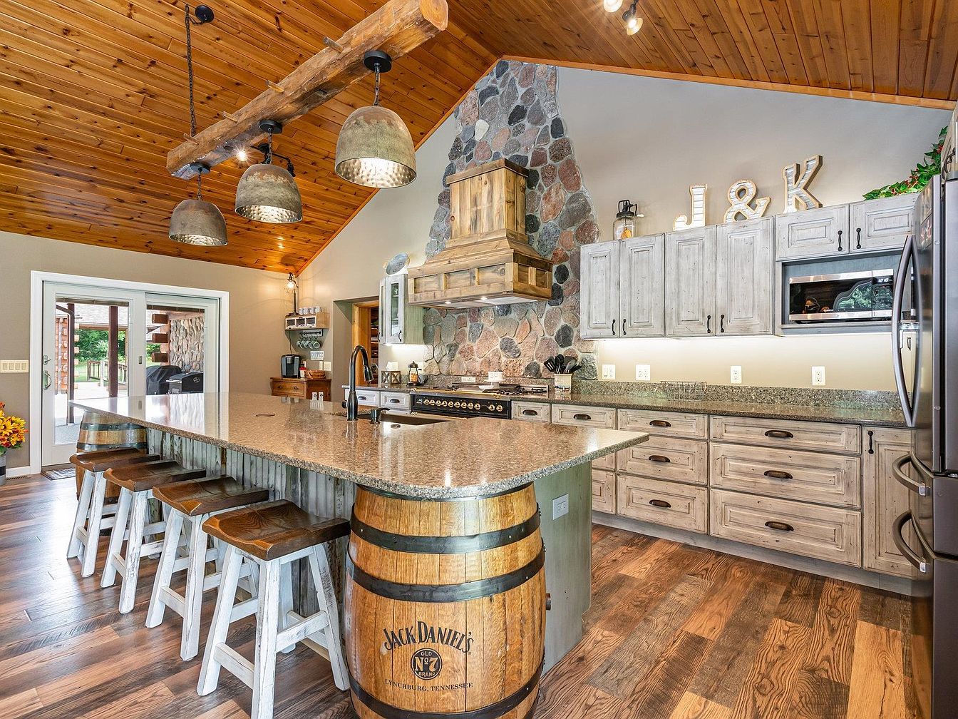 A spacious kitchen features a standout island with a polished, speckled stone countertop supported by rustic Jack Daniel’s barrels at each end. Four wooden bar stools with white legs are arranged along the long side of the island. The cabinetry has a distressed, pale finish, paired with black hardware, underlighting, and a stone mosaic accent wall rising behind the range. The vaulted ceiling is lined with knotty wood planks, and a thick, exposed timber beam suspends four industrial-style pendant lights above the island. The overall ambiance blends rustic farmhouse charm with industrial accents, highlighted by warm wood and natural stone textures.