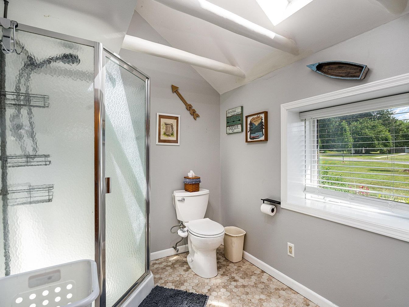A bright, airy bathroom featuring a corner shower with frosted glass panels and chrome trim on the left side of the image. The toilet sits against a soft-gray wall, flanked by a small beige wastebasket and a woven basket holding tissues. Above the toilet, whimsical wall décor includes a wooden arrow, framed artwork, and a rustic boat-shaped piece. The ceiling slopes gently with exposed beams, painted white. Sunlight pours in through a skylight, and a wide window with white blinds offers views of lush landscaping outside, further brightening the room. Light patterned floor tiles and a cozy gray bath mat complete the look.
