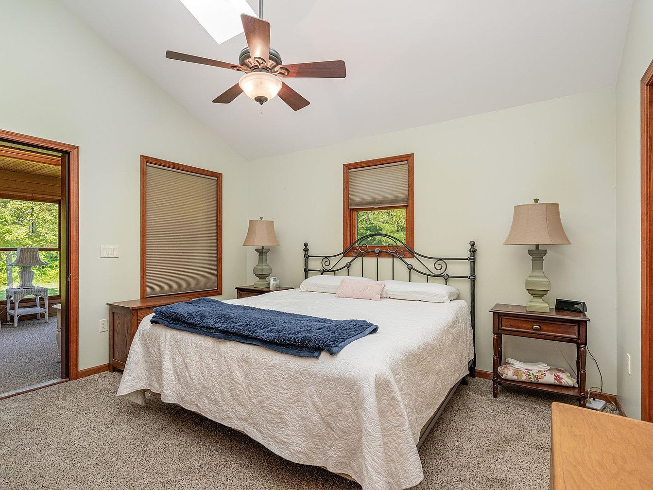 A cozy bedroom with a large, inviting king-sized bed featuring a white, patterned quilt and decorative metal headboard. Warm wood trim frames the two windows above the bed, which allow natural light to filter in, complementing the soft beige walls. Matching bedside tables on either side of the bed hold classic lamps with neutral shades and small essentials, one with neatly folded floral bedding beneath. The carpeted floor adds to the room’s comfort, while a navy throw provides contrast. Overhead, a ceiling fan with a light fixture and a skylight bring in both brightness and air circulation. An adjacent sunroom is visible through an open doorway.