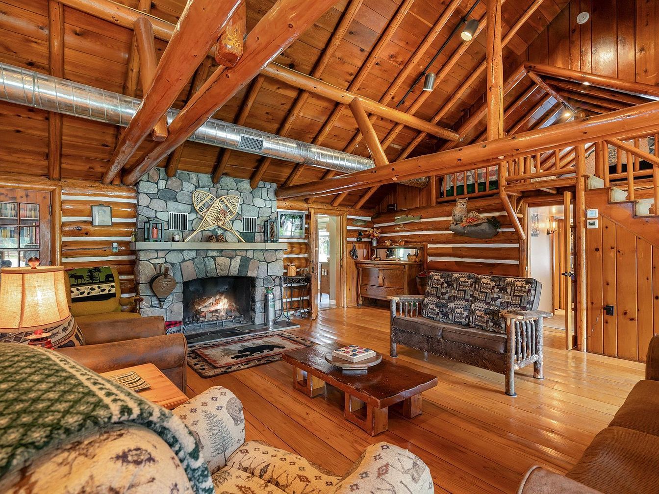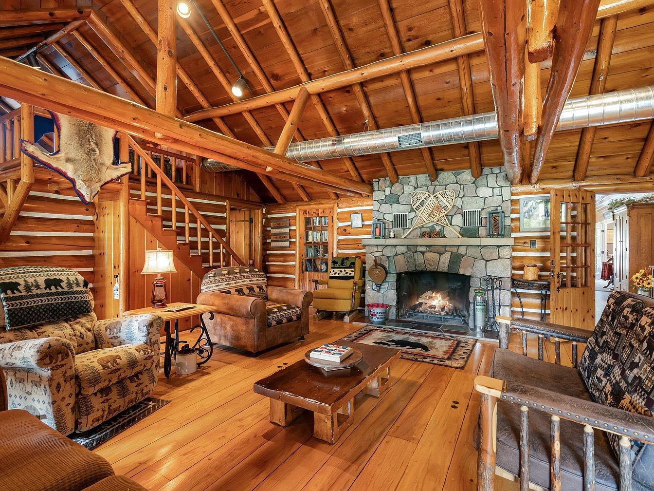 A spacious great room in a log cabin style home, featuring a large stone fireplace with a cozy fire burning. Warm golden wood finishes cover the walls, cathedral ceiling, and exposed beams, creating a rustic, welcoming atmosphere. Furnishings include a mix of patterned, upholstered chairs, a rustic wooden loveseat, and a solid wood coffee table. Bear and forest motifs appear on throws and pillows, adding to the lodge-like feel. Bookshelves, vintage lighting, and wood and stone textures complement the room’s historic charm. A staircase and loft area overlook the space, and natural light enters through multiple windows.