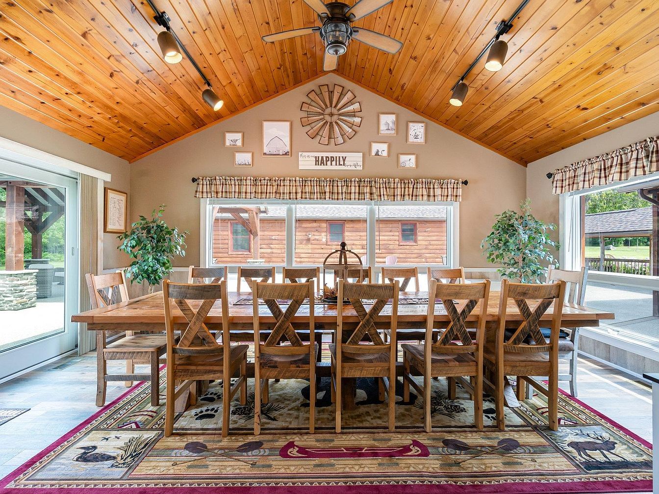 A spacious dining room centered around a large rectangular wooden table surrounded by twelve matching chairs, all with a rustic farmhouse design. The vaulted ceiling is clad in warm, honey-toned wood planks, complemented by track lighting and a ceiling fan. Two large windows, dressed with plaid valances, allow natural light to brighten the room and provide a view of the outdoors. Framed art and a decorative windmill hang above the windows, creating a cozy, welcoming atmosphere. Potted plants in the corners add greenery, while a patterned area rug featuring wildlife motifs anchors the furniture and enhances the rustic theme.