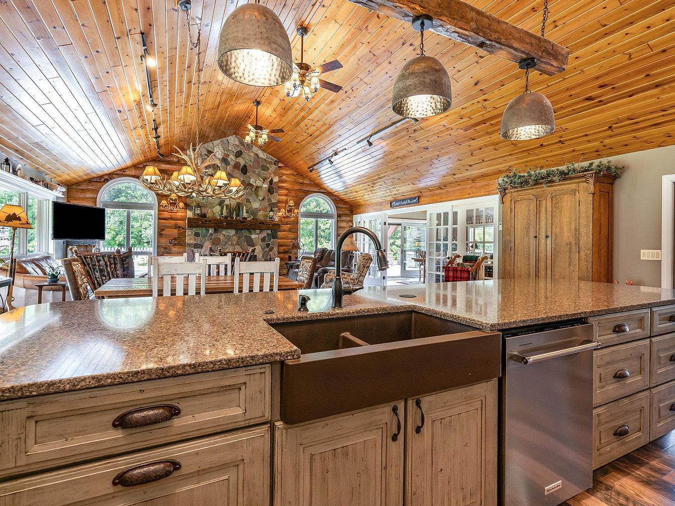 A spacious kitchen blends seamlessly with an open-concept living and dining area, unified by a warm, natural wood ceiling that slopes upward and log-style walls. The kitchen island features a deep farmhouse sink, cream-colored cabinets with rustic hardware, and speckled stone countertops. Overhead, three large industrial pendant lights hang from a rough-hewn wooden beam, casting a cozy glow. The living space includes large arched windows, leather seating, a stone fireplace with prominent log mantel, and an antler chandelier above a wooden dining table with white chairs. Earthy tones and natural textures dominate, creating inviting, cabin-inspired comfort.