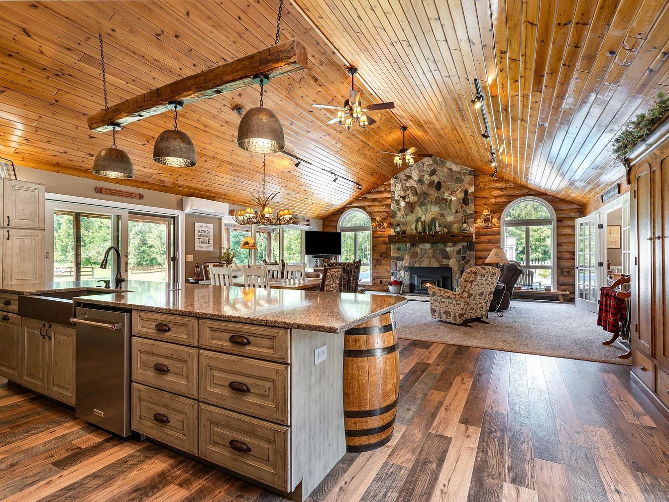 A spacious, rustic kitchen and living room combination with an open layout. The room features a striking wooden vaulted ceiling with warm, honey-toned planks and matching wood-paneled walls. The centerpiece is a large stone fireplace flanked by arched windows that bring in natural light and offer views of the greenery outside. The kitchen has a large island with a granite countertop, farmhouse sink, and rustic cabinetry. Barrels accent the island’s ends, reinforcing the lodge-like atmosphere. Pendant lights with exposed bulbs hang from a reclaimed wood beam, and comfortable seating and a cozy dining area complete the inviting, earthy ambiance.