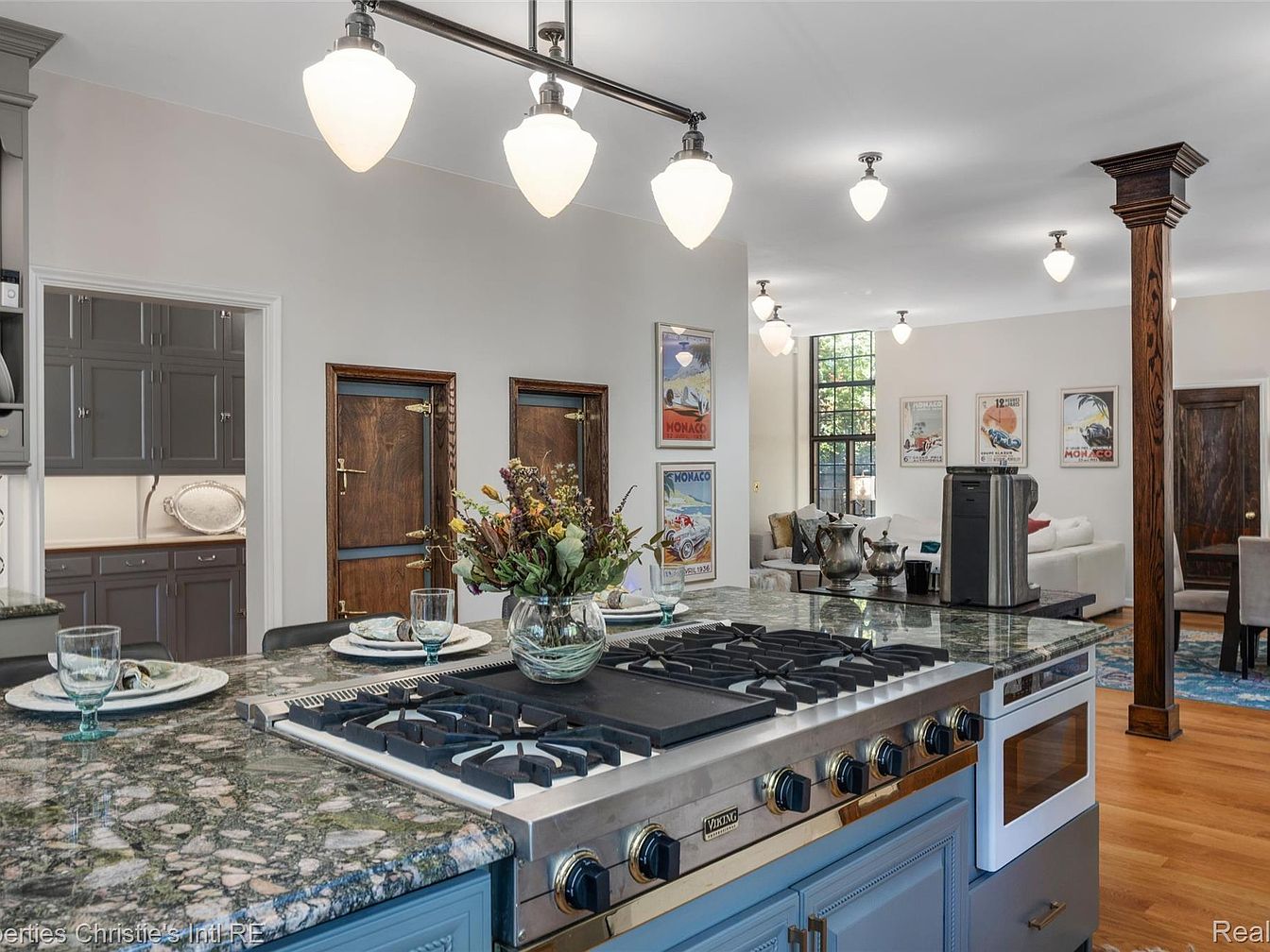 Featuring a spacious layout, this kitchen combines modern functionality with historic charm. The prominent center island showcases a luxurious granite countertop with intricate patterns, paired with a professional-grade gas stove. Above, stylish pendant lights emit a warm glow, enhancing the inviting atmosphere. The cabinetry is a chic dark grey, complemented by rich wood accents seen in the doorway and cabinetry details. A tasteful floral arrangement adds a natural touch, while retro-style artwork on the walls introduces vibrant colors. The kitchen flows into a cozy living area, visible through large windows, maximizing natural light and openness.