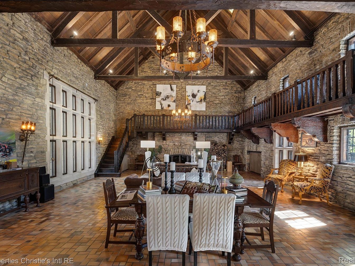 A spacious great room featuring high ceilings adorned with wooden beams. The dominant material is warm, textured stone walls, providing a rustic yet elegant backdrop. A large chandelier hangs centrally, casting a warm glow over the space. Luxurious brown leather sofas are arranged around a soft, layered area rug, enhancing comfort. A rectangular dining table, accompanied by stylish chairs, invites gatherings. Large windows with grid patterns allow ample natural light, brightening the room. Artistic elements, including wall art and decorative furniture, contribute to the inviting ambiance while reflecting a blend of historical charm and modern aesthetics.
