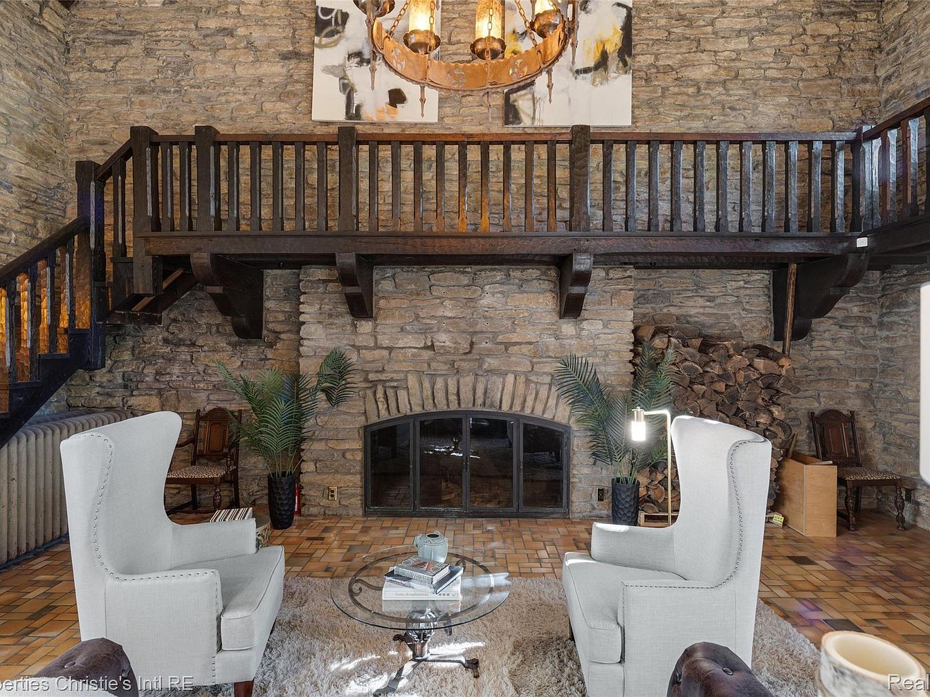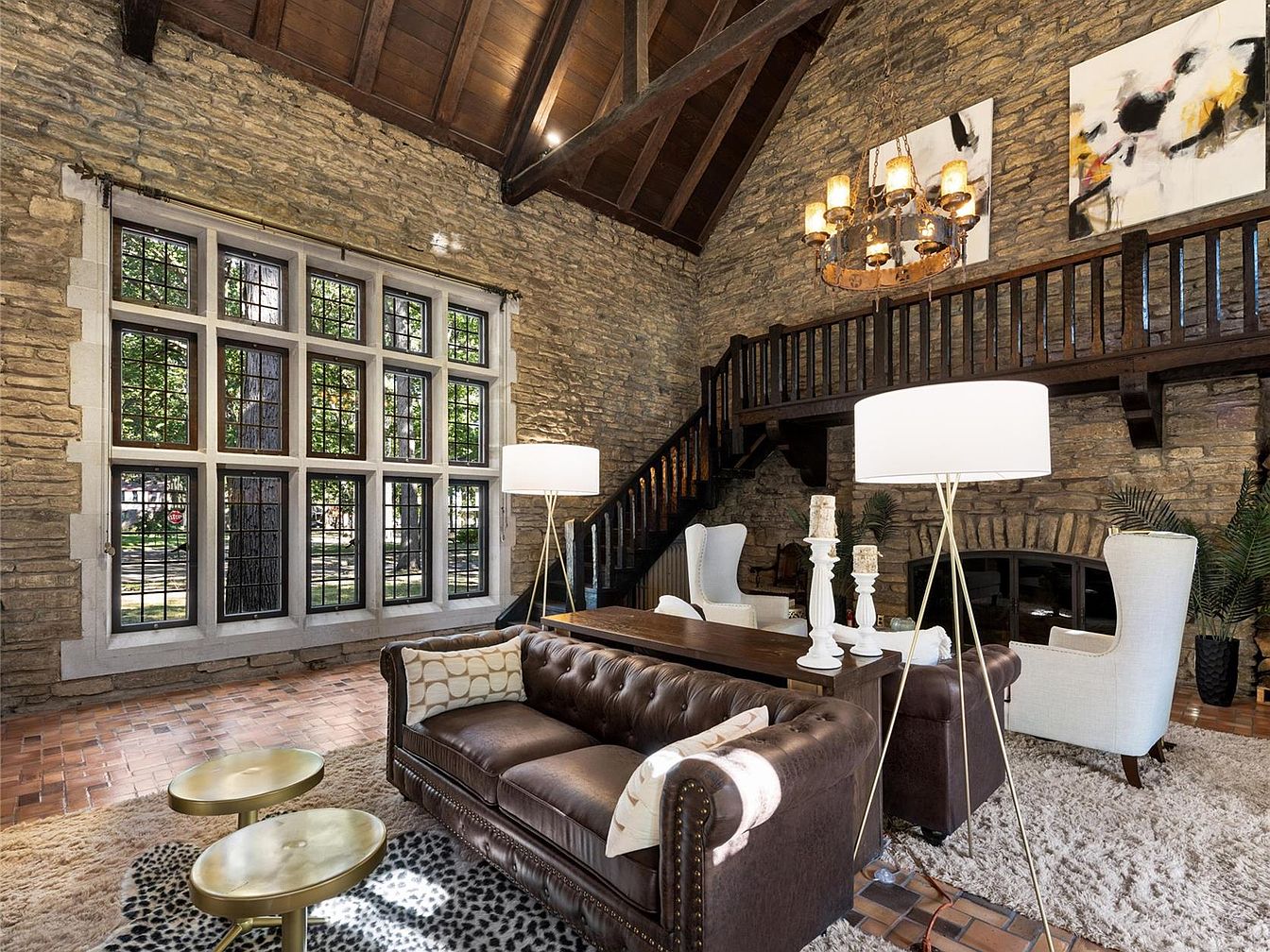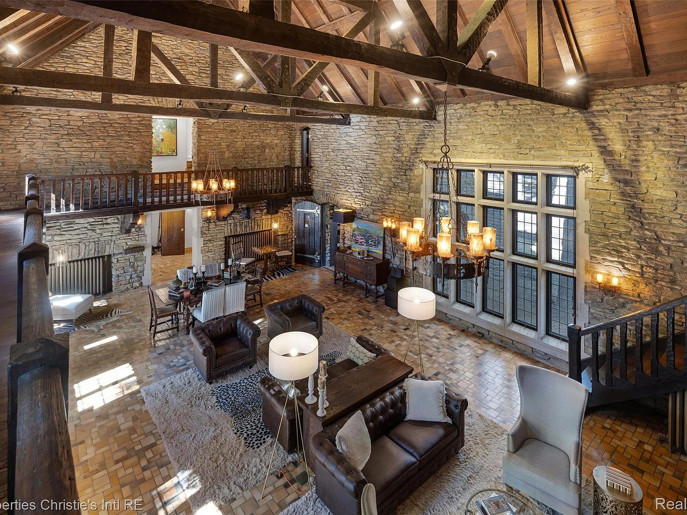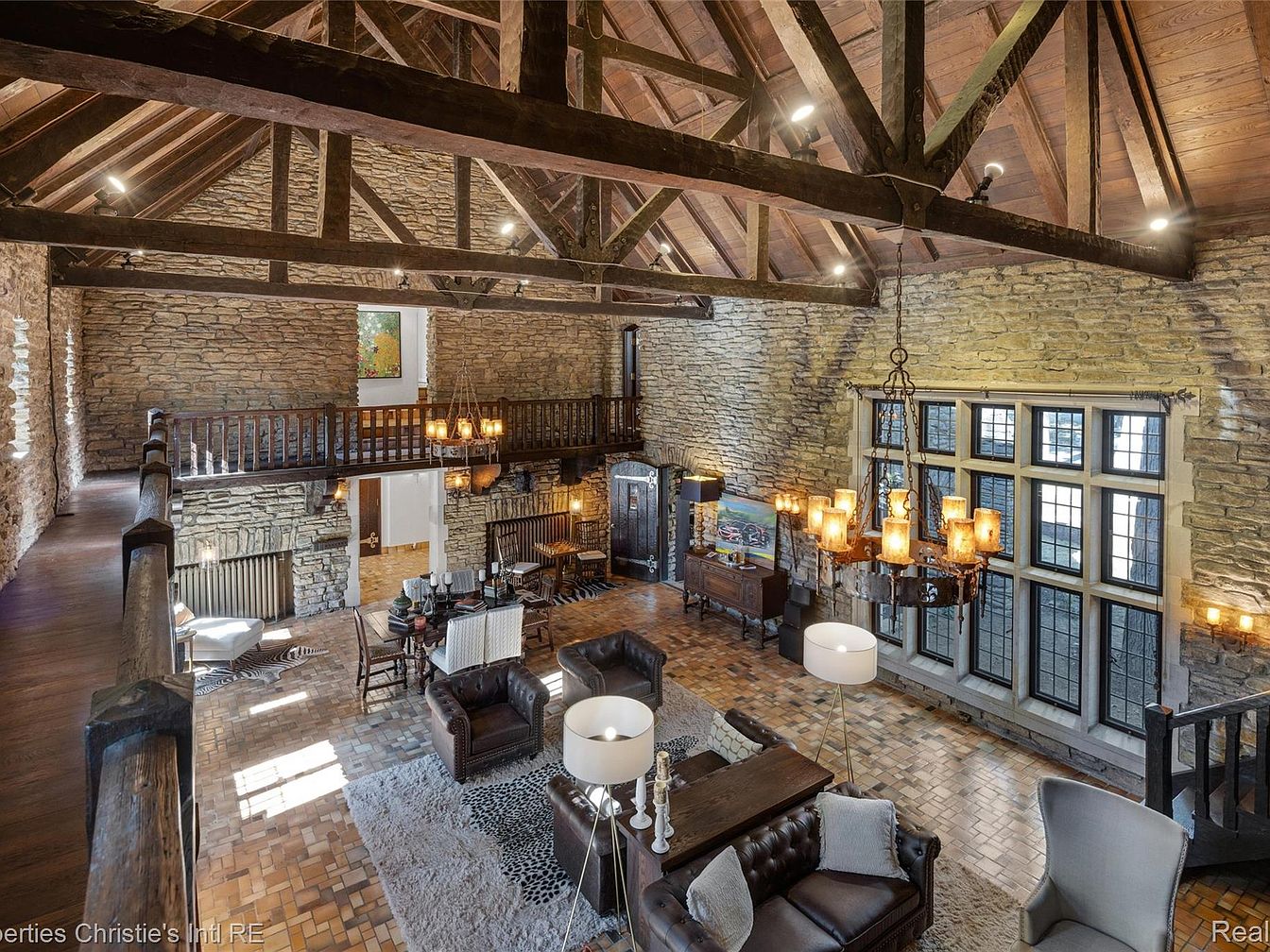 A spacious great room features a striking combination of rustic stone walls and exposed wooden beams. The layout includes a cozy seating area with plush leather sofas and a soft area rug, complemented by a stylish coffee table set. Large, divided-light windows allow natural light to flood the space, highlighting the unique textures of the stonework. A dramatic chandelier hangs from the vaulted ceiling, contributing to the room’s grandeur. The warm wood flooring contrasts beautifully with the cool tones of the stone, creating a harmonious atmosphere. An open loft area overlooks the main level, adding to the inviting openness.