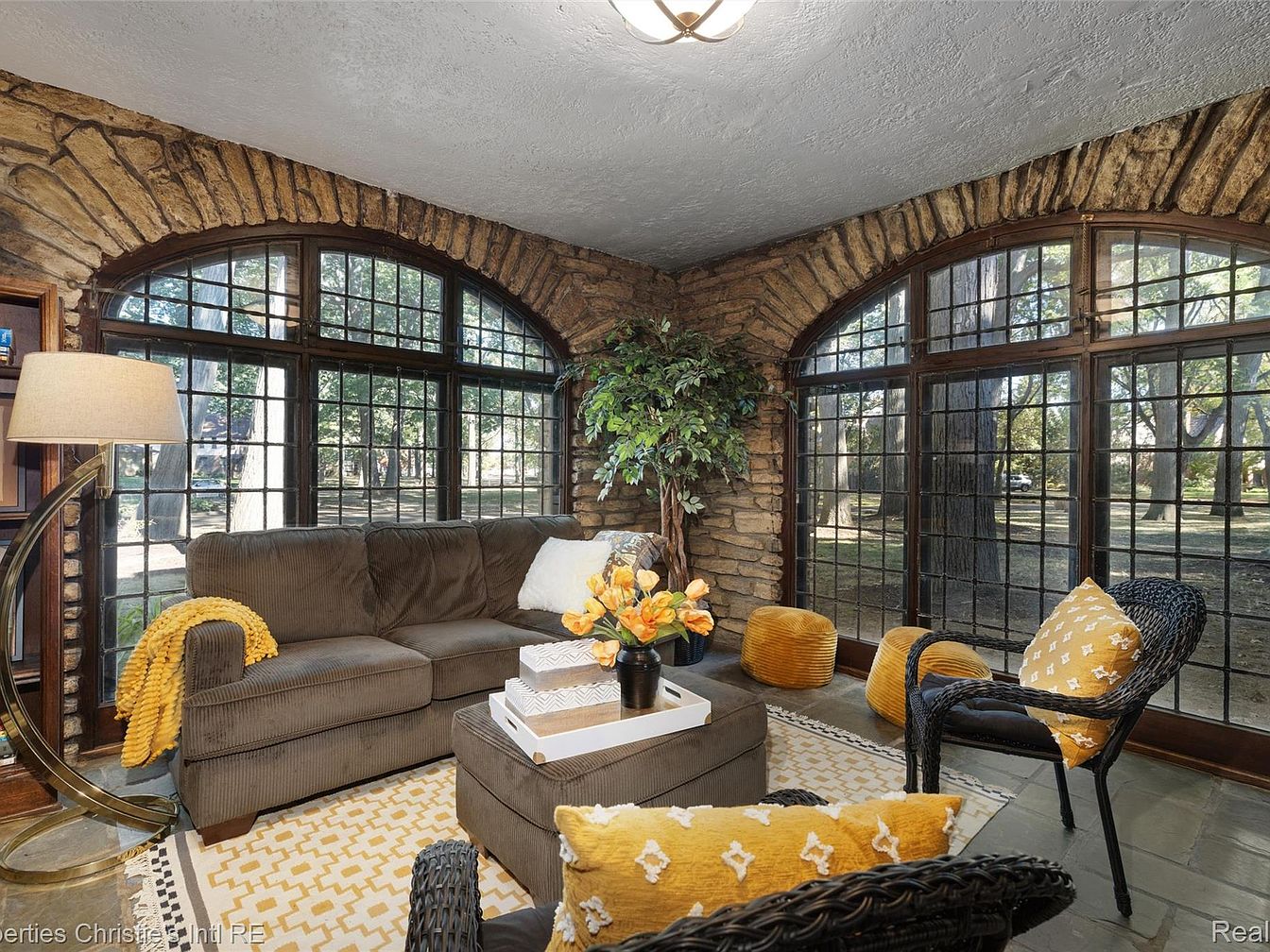 This sunroom features a cozy arrangement with a plush brown sectional sofa adorned with vibrant mustard yellow throw pillows. The walls are a warm, textured stone, enhancing the room’s inviting atmosphere. Large arched windows dominate one side, filling the space with natural light and offering views of the lush outdoors. A round coffee table holds a decorative arrangement of flowers and books. Complementing the seating are rattan chairs with matching yellow cushions, adding an element of comfort. The patterned area rug anchors the layout, tying together the color scheme of earthy tones and bright accents, creating a harmonious retreat.