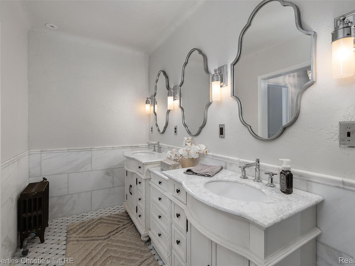 This bathroom features a classic design that blends elegance with functionality. The double vanity showcases a smooth, white marble countertop, enhancing the overall brightness. Two ornate mirrors with curved edges reflect light from stylish wall sconces, creating an inviting ambiance. White cabinetry provides ample storage, while a touch of vintage charm is added by the black radiator. The flooring, composed of black and white geometric tiles, complements the room’s sophisticated aesthetic. A decorative rug underfoot adds warmth, contrasting gently against the cool tones of the walls, which are adorned with subtle texture for added depth.