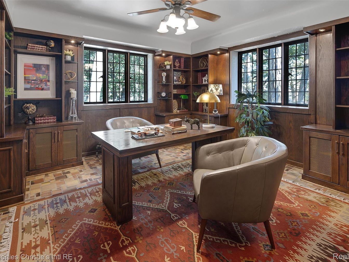 This home office features a rich, warm color palette with deep brown wood cabinetry and shelving. The layout includes a contemporary wooden desk positioned centrally, complemented by a plush, tufted armchair. A vibrant area rug with intricate patterns adds a pop of color to the space, while large windows provide ample natural light. Architectural details include decorative woodwork on the shelves and window frames, enhancing the room’s character. Additional decor elements, such as a green potted plant and art pieces, create a harmonious atmosphere, blending work and comfort in this inviting workspace.