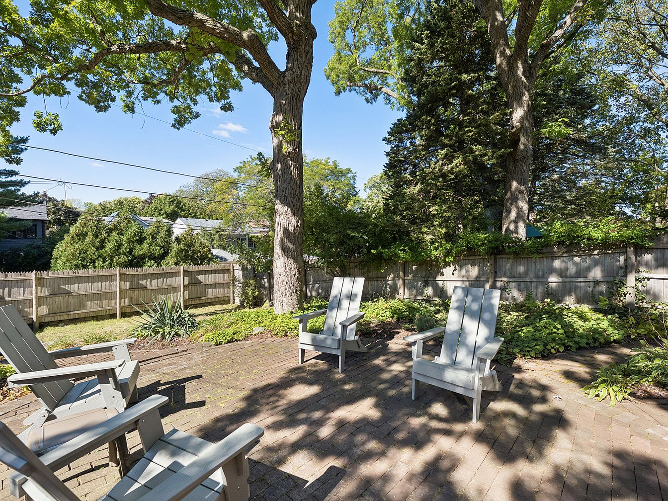 Four classic Adirondack chairs, painted a soft gray, are arranged in a relaxed conversational layout on a spacious brick patio shaded by mature trees. Dappled sunlight filters through the vibrant green canopy overhead, casting gentle shadows across the seating area. The patio is bordered by lush planting beds filled with low-maintenance greenery and framed by a wooden picket fence, offering privacy and a sense of enclosure. Beyond the fence, neighboring homes and additional trees are visible, enhancing the tranquil suburban ambiance. The space is ideal for outdoor gatherings, evoking a peaceful and welcoming atmosphere.