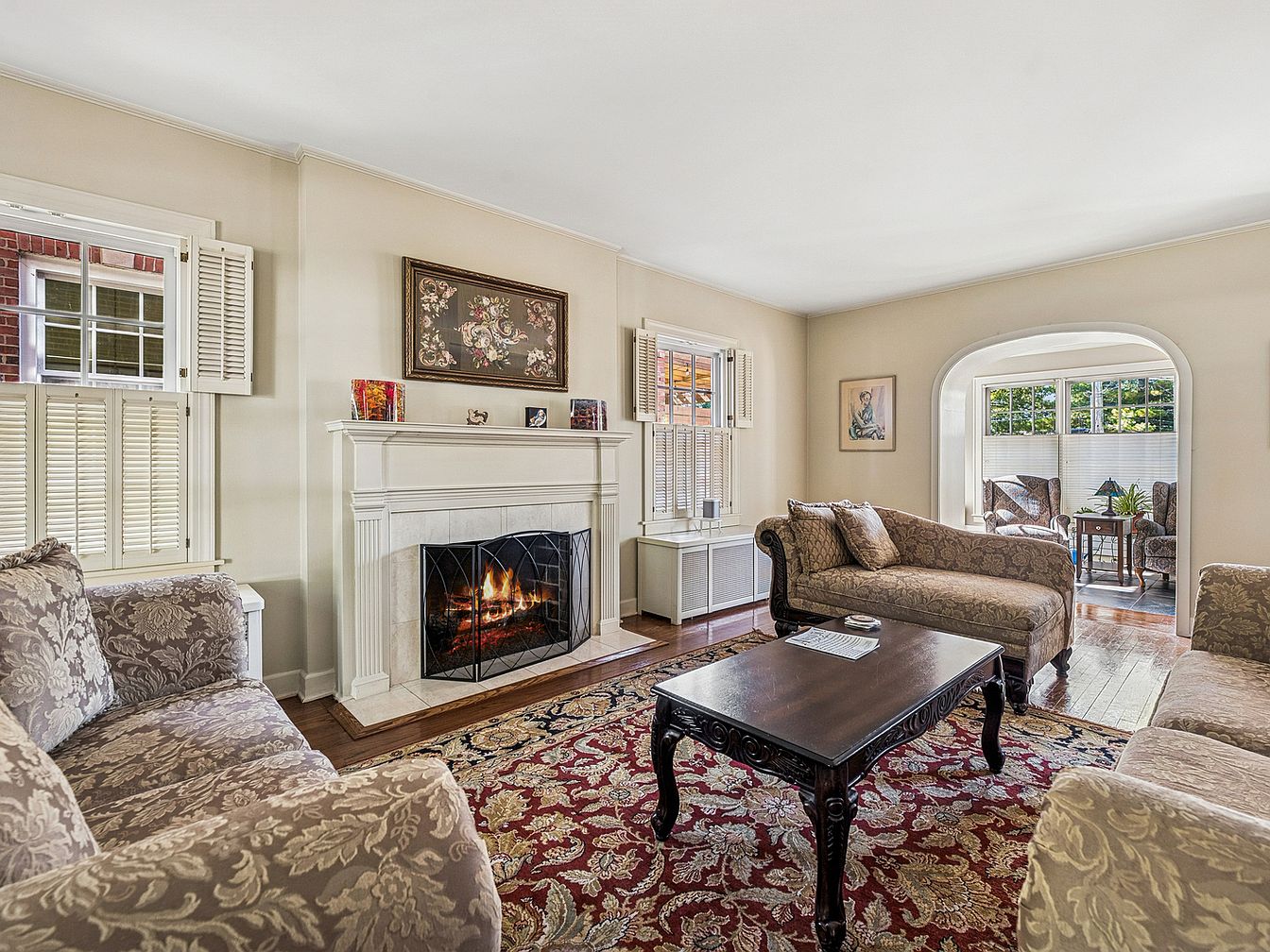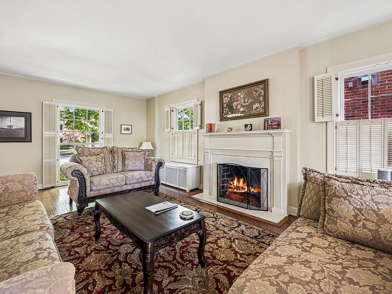 Traditional living room featuring light beige walls and white trim, with large windows fitted with white plantation shutters allowing natural light to brighten the space. An ornate fireplace topped with decorative molding anchors the room, with a floral painting and small personal items above the mantel. Furniture includes matching upholstered sofas with classic carved wood detailing and a dark wood coffee table set atop a richly patterned red and gold area rug. Hardwood floors complement the elegant, vintage vibe, while neutral tones, tasteful artwork, and detailed fabrics create a warm, inviting atmosphere with a touch of historic charm.