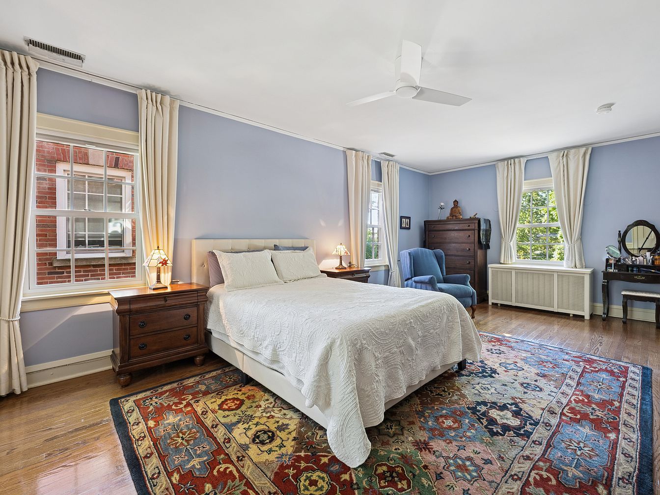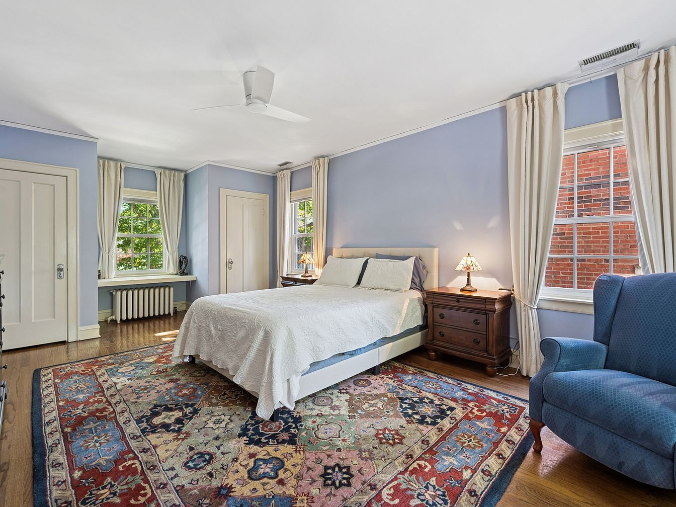 Soft blue walls provide a tranquil backdrop for this spacious bedroom featuring hardwood floors and a large, vibrant area rug with intricate patterns in red, blue, gold, and ivory. The bed is centered along one wall, dressed in crisp white bedding, flanked by classic wooden nightstands, each topped with a decorative lamp. Two generous windows are framed by long, light-colored curtains, letting natural light brighten the space. An upholstered blue armchair sits in one corner, adding comfort and a touch of traditional style. Architectural details include crown molding, white closet doors with retro hardware, and a radiator under one window.