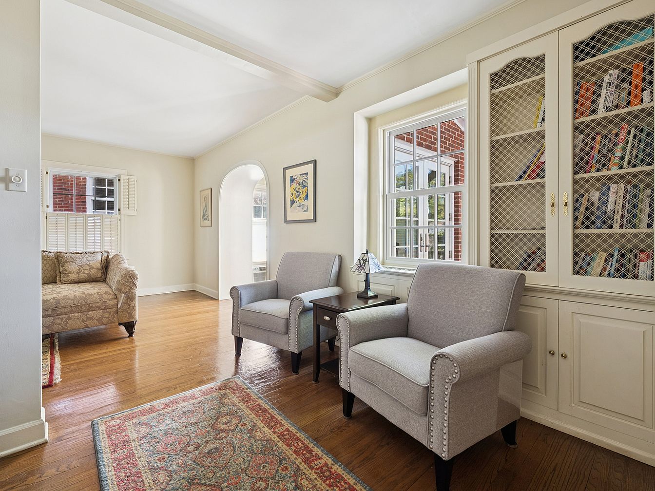 A cozy nook features two light gray upholstered armchairs with nailhead trim, positioned near a window that allows soft natural light to flood the space. Between them is a small dark wooden side table topped with a classic Tiffany-style lamp. To the right, built-in cabinetry with lattice doors displays neatly arranged books. The walls are painted a warm cream shade, enhancing the inviting ambiance. The floor is polished hardwood, partially covered by an ornate patterned rug in warm red and blue tones. Off to the side is a vintage floral settee, and a graceful archway leads into an adjoining room.