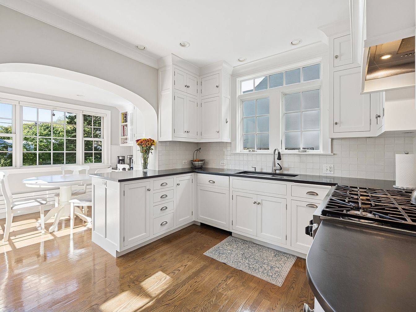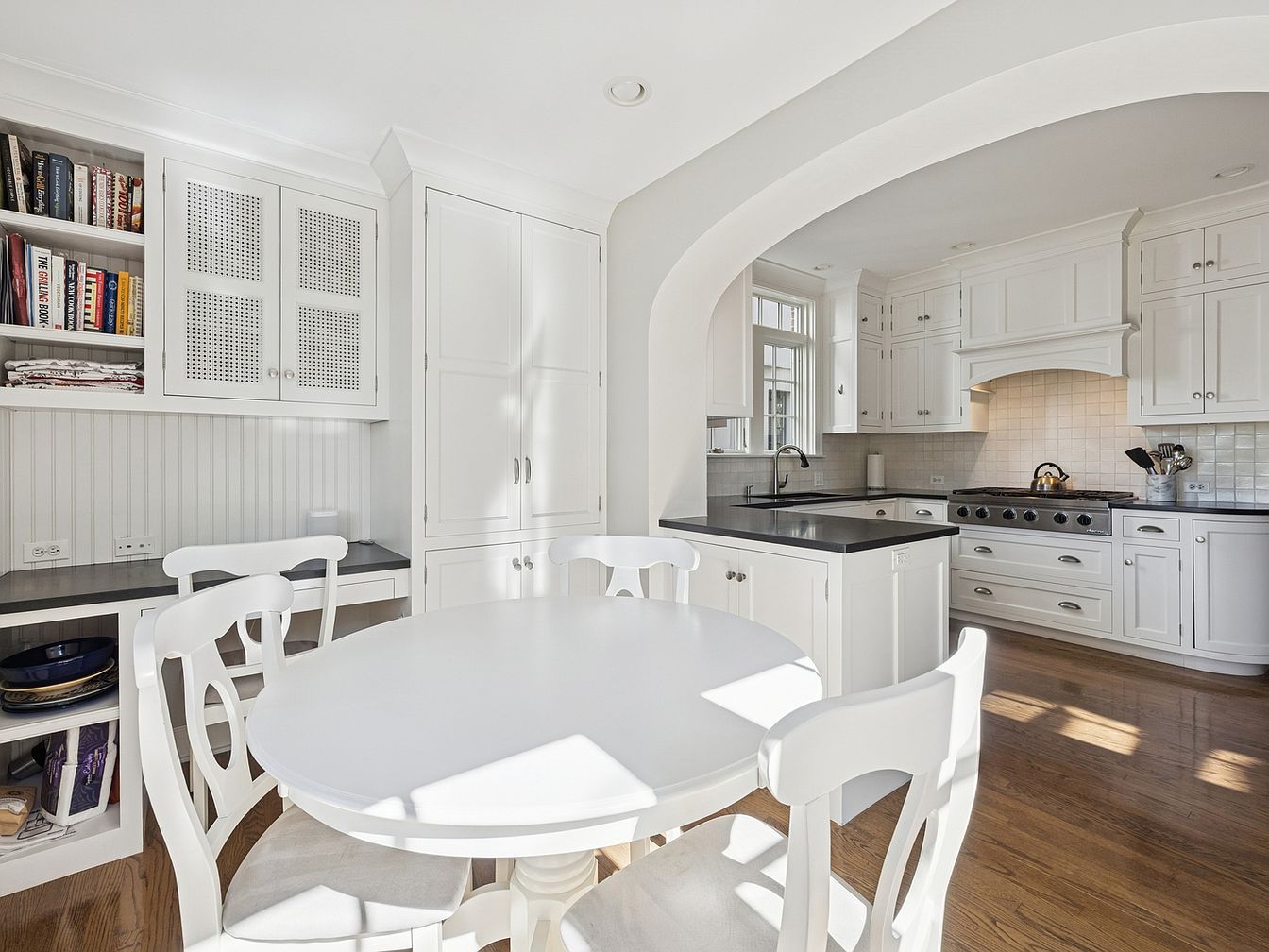 A bright and airy kitchen space with crisp white cabinetry and classic panel details. The breakfast area features a round white wooden table with four chairs, positioned on a warm-toned hardwood floor. Built-in shelves and cabinetry line one wall, displaying cookbooks and neatly stacked tableware. An arched opening separates the kitchen workspace, which has black countertops, a large gas range with a hood, and a deep sink under a window that lets in abundant natural light. The overall design feels fresh and timeless, with subtle beadboard and beautifully coordinated hardware adding historical charm.