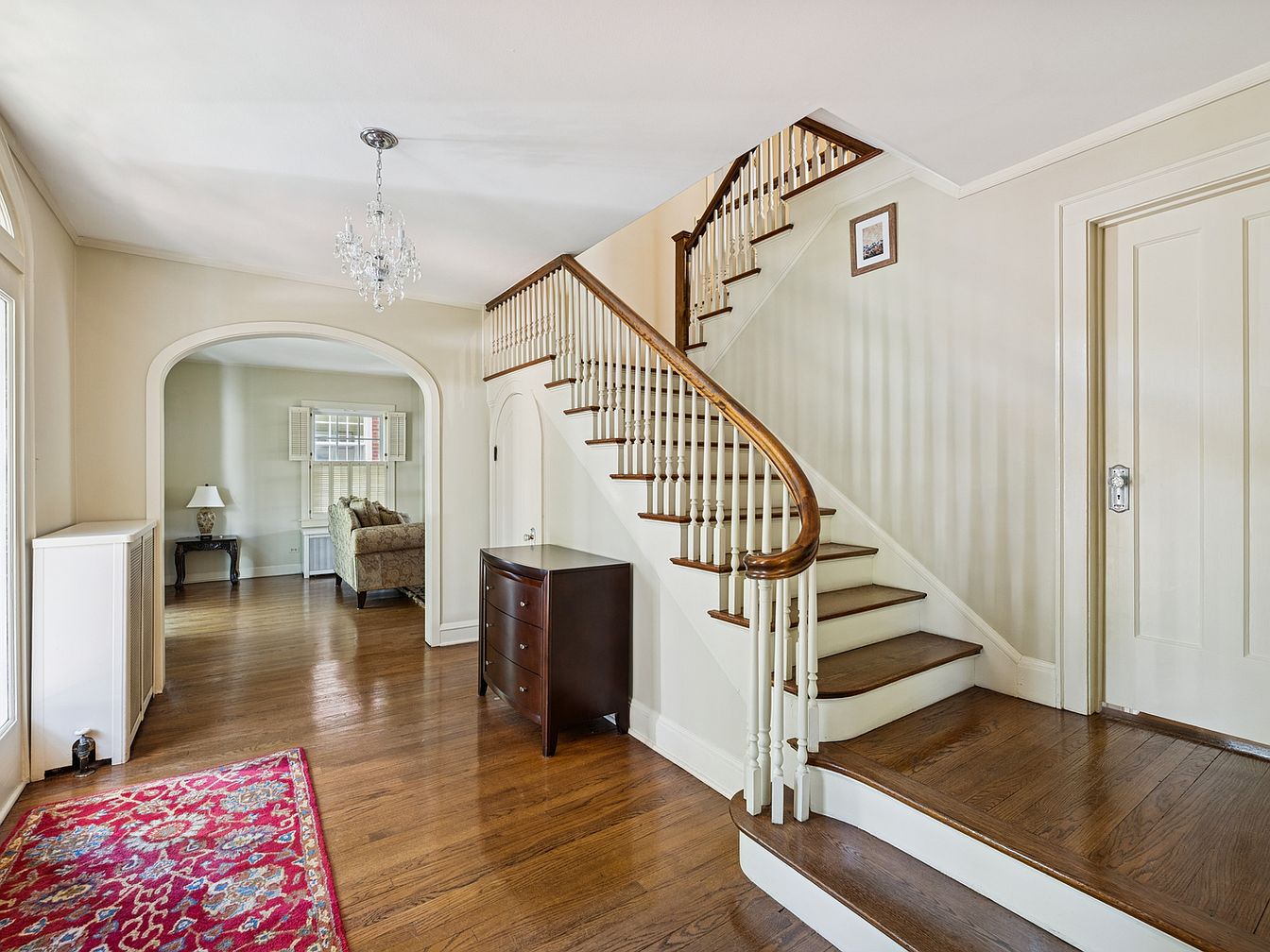 Spacious entryway with warm, medium-toned hardwood floors and cream-colored walls, featuring a prominent curved staircase with white risers and varnished wood handrails and treads. A crystal chandelier hangs from the ceiling, adding a touch of elegance. An ornate, red-patterned area rug adorns the floor near the door. To the left, an arched doorway leads into a cozy living space, furnished with a plush sofa, dark wood side table, and table lamp. White wooden trim and subtle moldings create a classic, historic American home ambiance. Minimal, tasteful decoration enhances the bright, welcoming atmosphere.