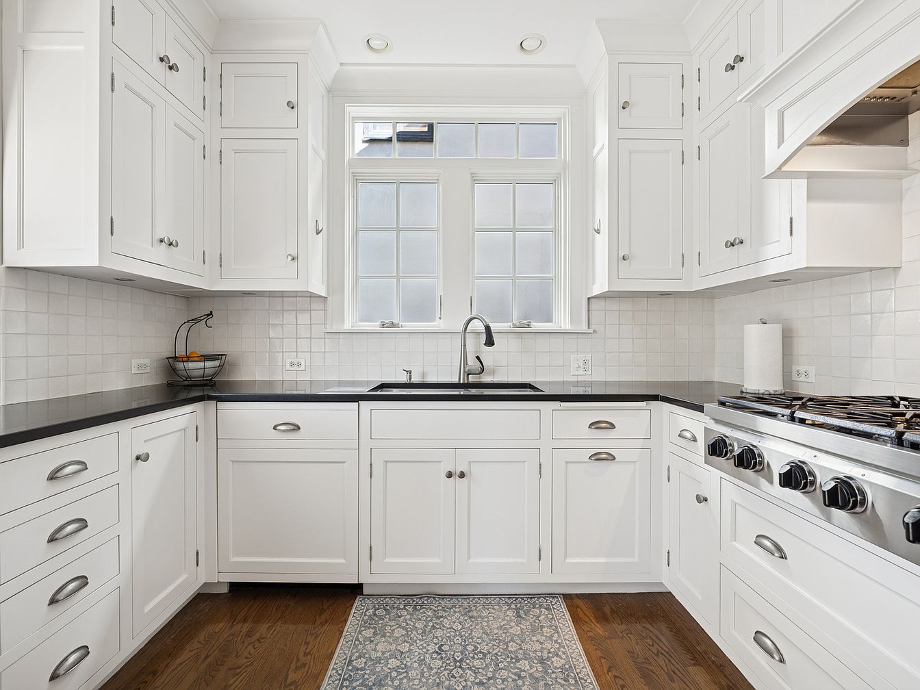 A bright, U-shaped kitchen features classic white cabinetry with chrome handles and a sleek black countertop. The upper and lower cabinets offer ample storage space, and the backsplash consists of glossy, square white tiles. Centered on the back wall, a large divided window brings natural light into the room, positioned above a modern undermount sink with a single-lever faucet. To the right, a professional-grade stainless steel stove with multiple burners is accompanied by a paper towel holder. The warm wood flooring adds contrast, while a light patterned rug softens the space, enhancing its welcoming and timeless feel.