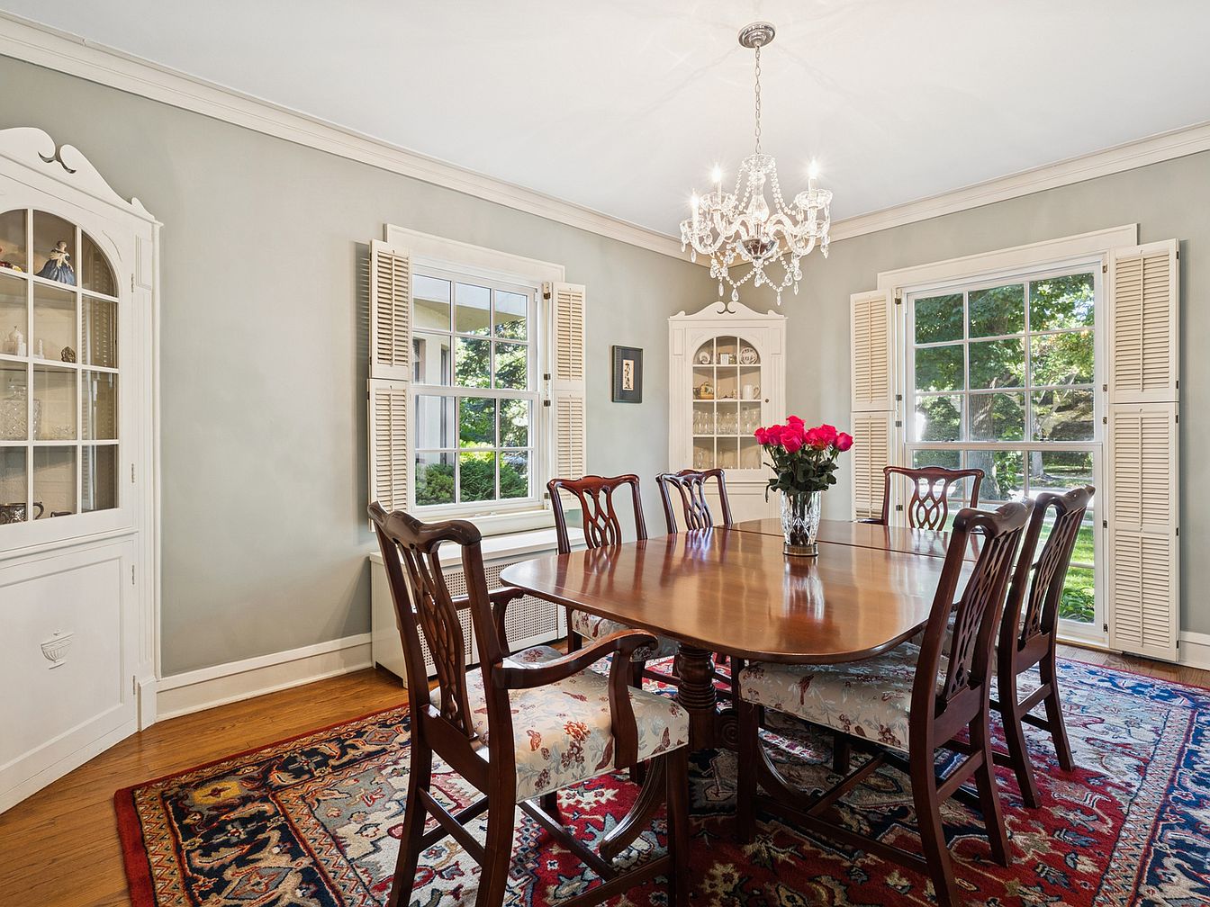 A spacious, elegant dining room with a large polished wooden table surrounded by eight matching carved chairs, each upholstered with a floral fabric. The room features two prominent bay windows framed with white wooden shutters that let in abundant natural light, revealing green views outside. Built-in white display cabinets with glass doors sit in the corners, showcasing fine china and decorative items. A sparkling crystal chandelier hangs above the table, adding a touch of formality. Walls are painted a serene sage green, complemented by intricate white crown molding and baseboards. A richly patterned oriental rug in deep reds, blues, and creams covers the hardwood floor, adding warmth and sophistication.