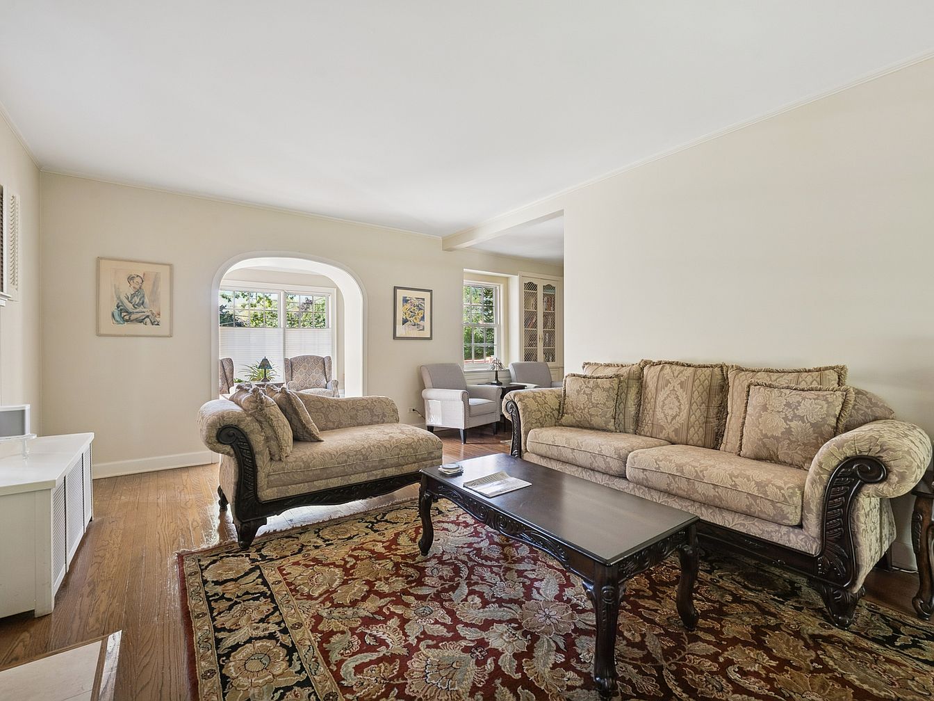 This spacious living room features creamy off-white walls and wood flooring, creating a warm, inviting backdrop for traditional furnishings. An ornate red and gold area rug anchors the room, complemented by a classic wooden coffee table. The plush sofa and chaise lounge are upholstered in light gold damask fabric with carved dark wood accents. Built-in shelving and soft armchairs decorate the far end near a sunny bay window, which fills the room with natural light. Two delicate art pieces on the wall and subtle archways contribute to the home’s historic charm and refined elegance.