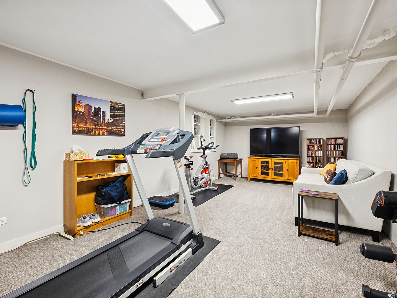 A multifunctional basement space combining a home gym and a cozy media area, decorated with neutral tones and subtle modern accents. The floor features light beige carpeting, creating a soft contrast with the plain white walls and exposed ceiling pipes. Exercise equipment including a treadmill and stationary bike is positioned near one wall, with a small wooden bookshelf and workout gear neatly organized. A large flat-screen television sits atop a honey-toned media console, flanked by a CD shelf and paired with a plush ivory loveseat accented by colorful pillows. Minimalist cityscape art and strategic soft lighting add a welcoming, practical ambiance.