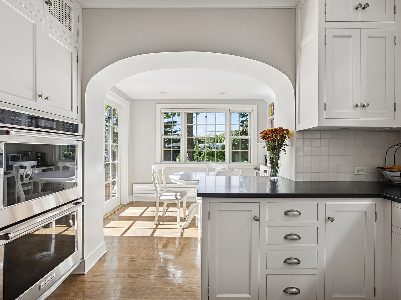 A sunlit kitchen extends into a cozy breakfast nook framed by a graceful archway. The kitchen features white cabinetry with shaker-style doors, stainless steel double wall ovens, and dark countertops accented by a vase of fresh flowers. Soft beige walls and subtle white tile backsplash add elegance. Natural light pours in through a large window and adjacent glass-paned door, illuminating the glossy hardwood floors. The breakfast nook includes a round white table with matching white chairs, positioned to take advantage of lush views through the wide window, creating an inviting space for morning meals and casual gatherings.