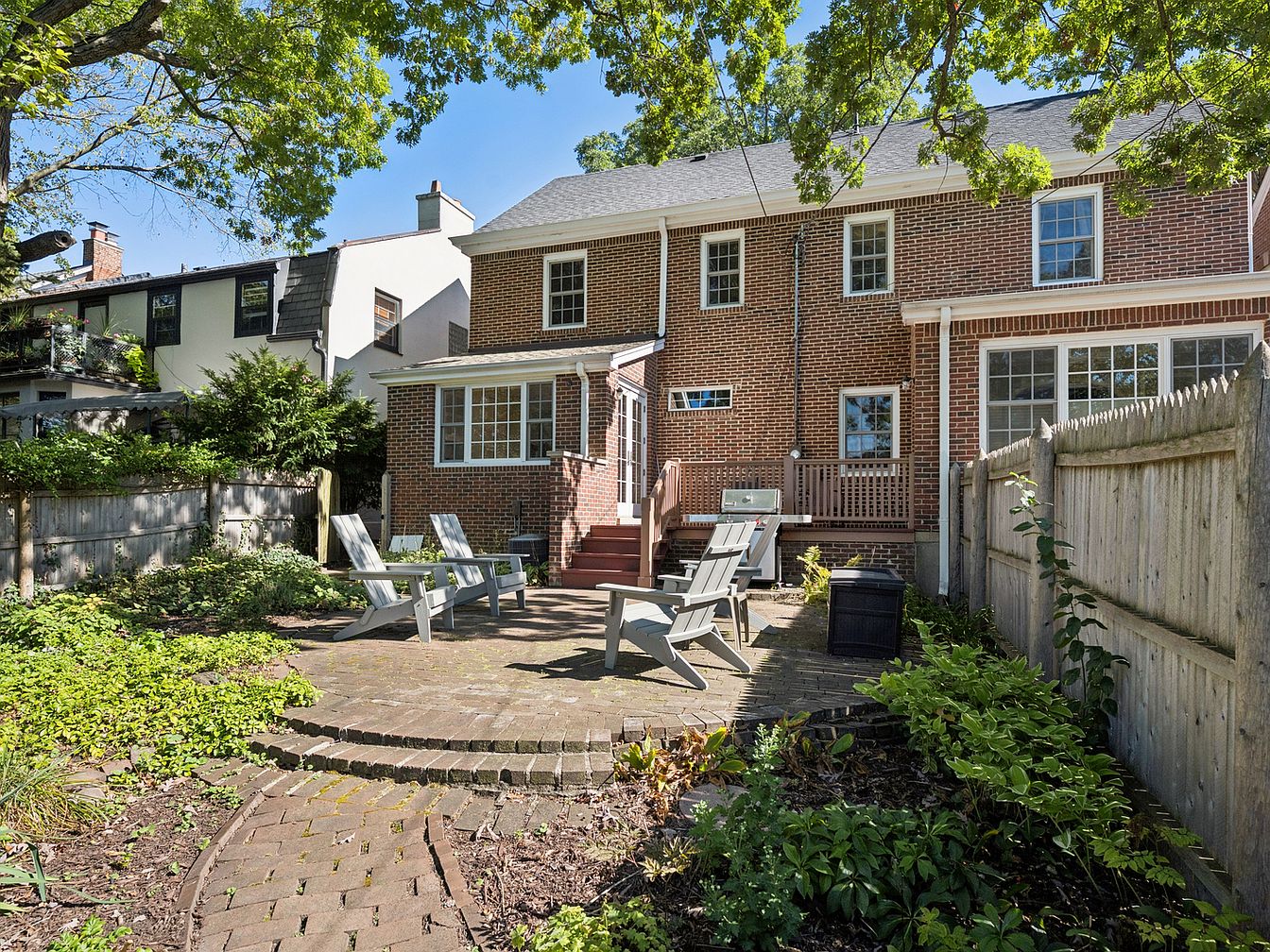 A brick patio sits behind a historic red brick house, enclosed by a weathered wooden fence and surrounded by lush greenery. Several Adirondack chairs circle a central fire pit, providing relaxed outdoor seating. The space is shaded by the leafy branches of mature trees overhead, creating a peaceful, inviting atmosphere. A set of red-painted steps leads from the house to the patio, connecting to a small wooden deck off the rear entry. The garden beds around the patio feature a mix of ground cover and shrubs, adding natural softness to the structured, classic design of the outdoor area.