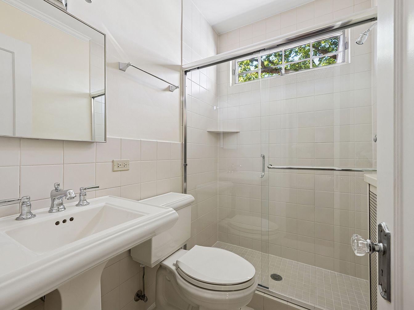 A compact and classic bathroom featuring a walk-in shower enclosed by clear glass with a chrome frame. The shower tiles are a soft cream color, complementing the rest of the neutral tilework throughout the room. A large rectangular mirror hangs above a pedestal sink, which features shiny chrome fixtures. The toilet is directly beside the sink, beneath a chrome towel bar set into the tiled wall. Above the shower, a narrow horizontal window allows natural light to brighten the space, while offering a view of leafy green trees outside, giving the room an airy and inviting atmosphere.