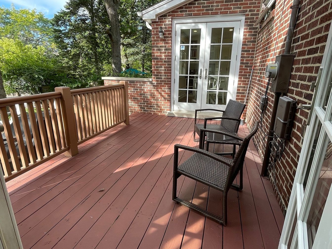 A wooden patio with reddish-brown planks extends from the house, partially enclosed by a matching wooden railing. Two dark brown woven chairs, each with metal frames, are placed alongside a small glass-top table, providing a comfortable spot for conversation or relaxation. The backdrop features a classic red brick exterior wall and a set of white-framed double French doors with multiple glass panes, leading indoors. Surrounding the patio are mature green trees, lending shade and a tranquil, natural atmosphere. The overall design merges traditional American charm with cozy outdoor living, accented by practical electrical fixtures on the wall.