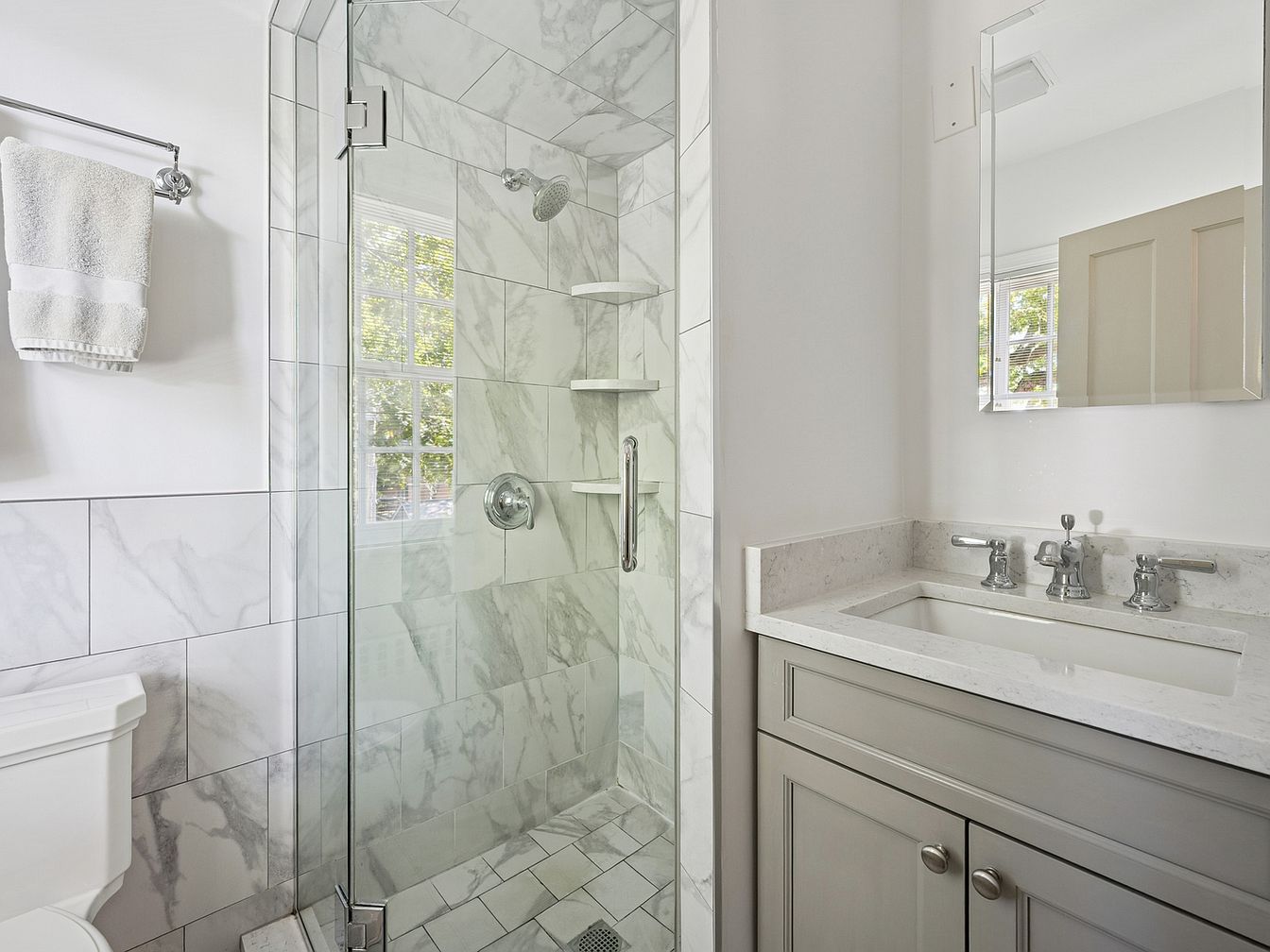 A compact bathroom is shown featuring a walk-in shower with glass doors and walls of white and gray veined marble tile. The vanity is topped with a light-colored marble countertop and is fitted with a rectangular sink, chrome faucets, and gray cabinetry. To the left, a white toilet sits below a chrome towel rack holding neatly folded white towels. The walls are painted a soft white, enhancing the sense of cleanliness and light. A large frameless mirror above the sink reflects natural light streaming through a nearby window, creating a bright, serene atmosphere.