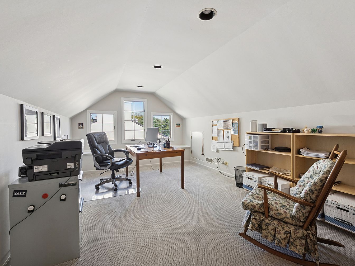 A bright, airy attic office features sloped ceilings painted white, giving the room a spacious, open feeling. Beige carpeting runs wall to wall. Three large windows at the far end flood the space with natural light, providing a clear view outside. The room is furnished with a wooden desk and modern swivel chair in black leather, along with a large office printer atop a file cabinet. Along the right wall, open shelves and storage boxes keep papers organized. A floral-upholstered rocking chair adds a touch of vintage charm, while a corkboard pinned with notes provides a functional workspace accent.