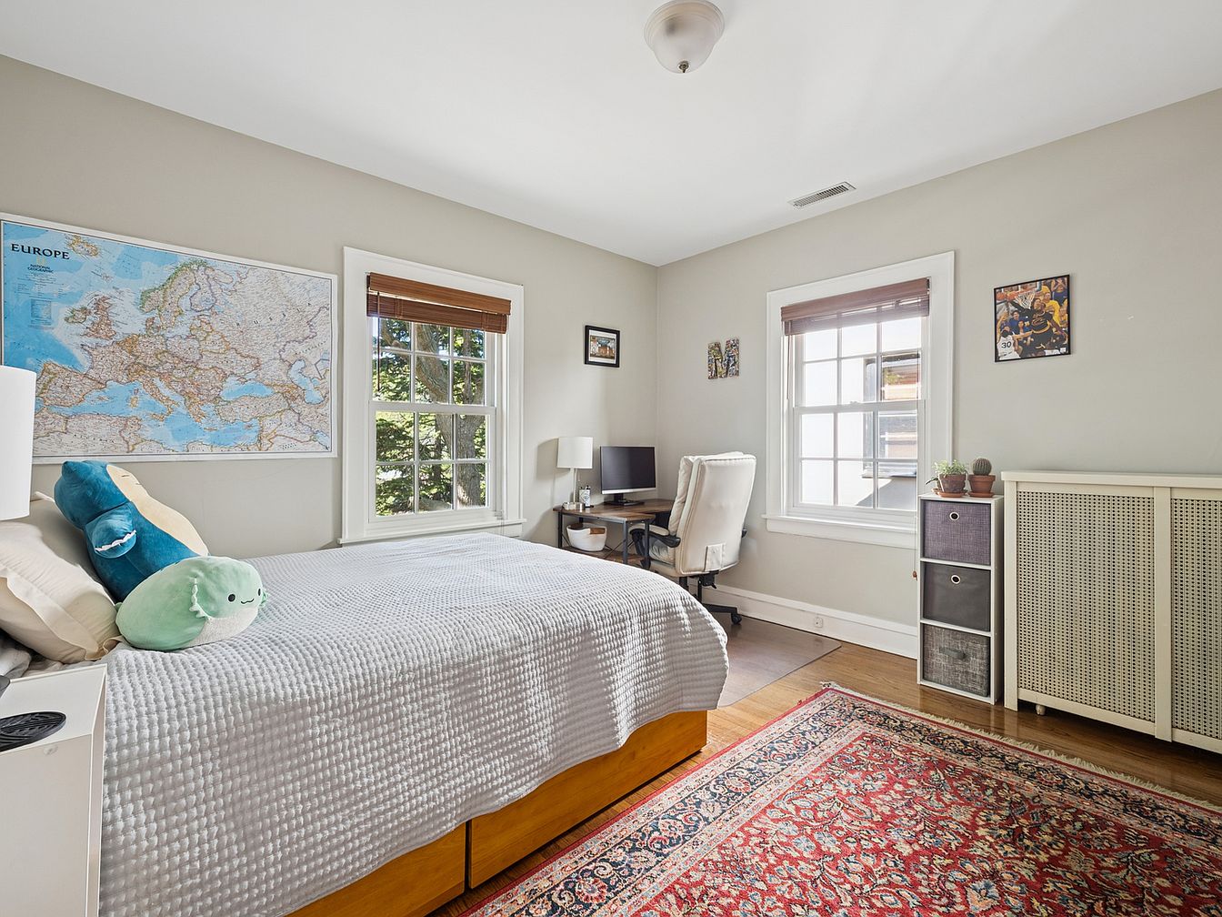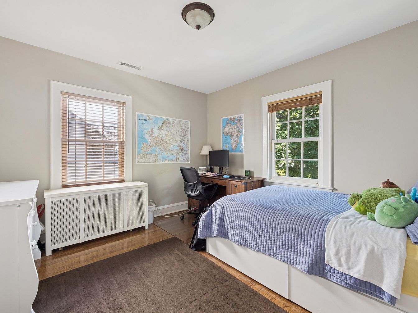 A bright and inviting bedroom featuring a corner workspace and twin-size bed. Two large windows with classic white trim bring in natural light and overlook greenery. Neutral beige walls and hardwood floors create a warm, calming backdrop. The bed is made with a light blue quilt and decorated with plush toys, adding a touch of playfulness. The wooden desk holds a computer and lamp, accompanied by a black ergonomic chair. Wall maps of Europe and the world add educational flair. A brown rug grounds the space, and a radiator cover beneath one window complements the room’s clean, functional aesthetic.