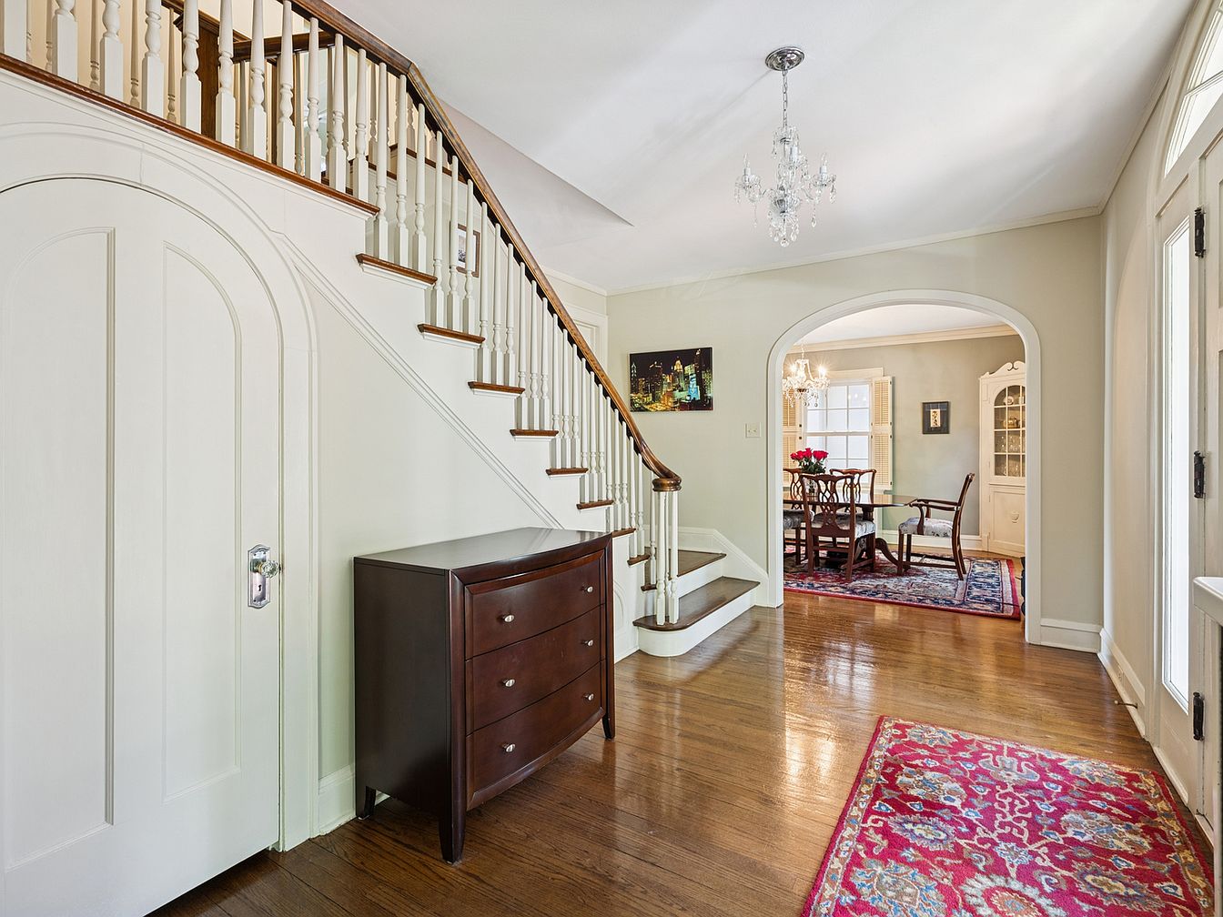 A wide entry hall features gleaming hardwood floors and soft cream-colored walls. On the left, a graceful staircase with wooden treads and white spindles rises to the upper floor, with an arched doorway underneath. A dark wood chest of drawers sits beneath the stairs, lending traditional warmth to the space. A sparkling crystal chandelier hangs from the ceiling, adding elegance. At the far end, an arched opening leads to a formal dining room with a richly patterned area rug and a wooden dining set. A red and blue paisley-patterned runner provides a pop of color along the hall floor.