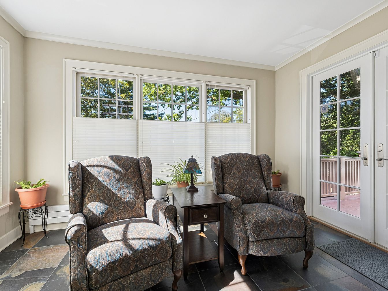 Bright and inviting space featuring two upholstered armchairs with intricate, classic patterns positioned around a small wood side table. The room is framed by large windows bringing in abundant natural light, with partial white blinds filtering the sunshine and giving a calm ambiance. Potted plants are arranged on either side, sitting on decorative stands and the table, adding a touch of greenery. The walls are painted a soft beige, while slate tile flooring anchors the room. French doors lead out to a deck, visually connecting the interior with the outdoor landscape.