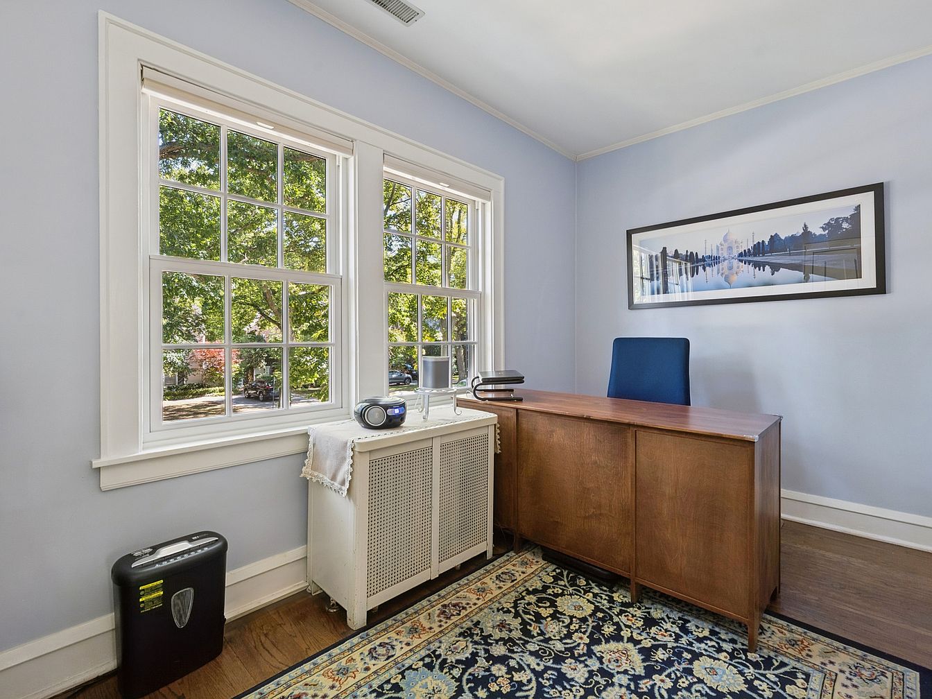A serene work space featuring soft blue walls and crisp white trim creates a calming, airy atmosphere. Large double windows bring abundant natural light and views of mature green trees into the room. A wooden desk with clean lines sits against one wall, complemented by a simple blue upholstered chair for seating. A patterned oriental rug in blue, cream, and gold tones covers the hardwood floor, adding warmth and texture. A small shredder stands discreetly in the corner. Above the desk, a panoramic framed print of a tranquil lakeside scene extends the soothing feel of the space. Overall, the decor is understated and inviting.