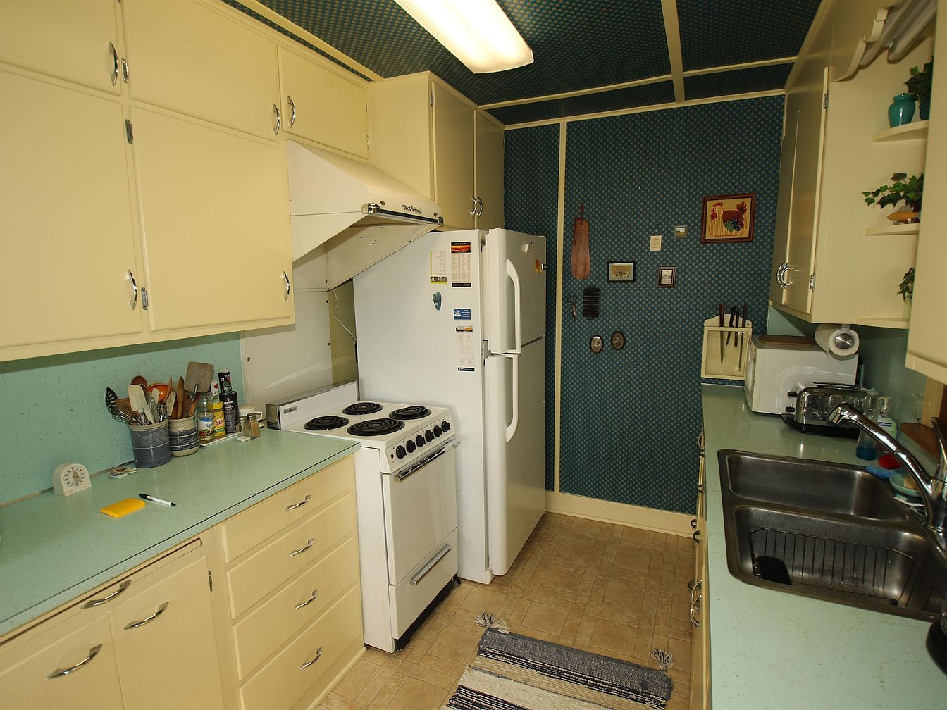 This image features a compact galley kitchen with a retro charm. The cabinets are painted a soft cream color with shiny metal handles, and the countertops are a pale mint green. A white freestanding electric stove and matching refrigerator stand along one wall, with small kitchen appliances—such as a toaster and microwave—neatly arranged nearby. The backsplash and ceiling have a blue patterned wallpaper, adding a cozy, vintage touch. There are decorative items including framed pictures and kitchen utensils hanging on the wall, along with potted plants on open upper shelves for a homey, lived-in feel. The floor is covered in light tan linoleum, and a woven rug lies in front of the sink.