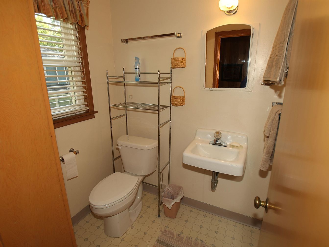 A compact bathroom with beige walls and hexagonal tile flooring in soft neutral tones. A white toilet sits beneath a metal storage rack with open shelving and two small wicker baskets. Directly next to the toilet is a white porcelain wall-mounted sink with a chrome faucet and bar soap resting on the edge. Above the sink is a rectangular mirror with a simple white frame, flanked by a towel rack with neatly folded beige towels. Natural light enters through a window with a wooden frame, white blinds, and a short ruffled valance in muted tones. The overall aesthetic is clean, functional, and subtly traditional.
