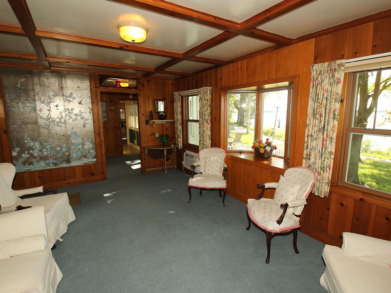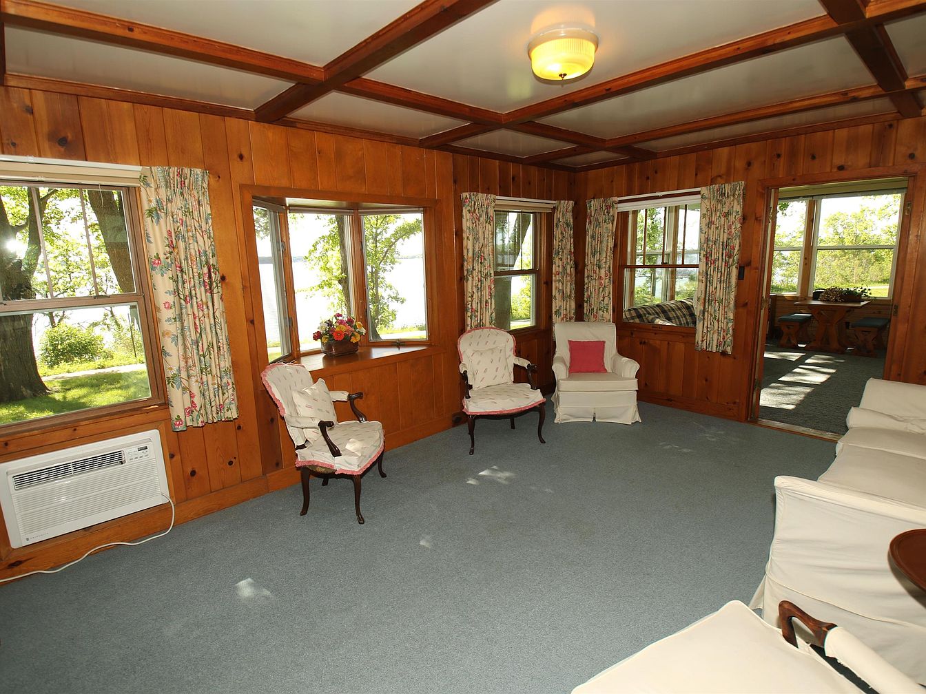 A spacious living room features honey-colored wood paneling and a grid-patterned wood beam ceiling, both contributing to a rustic, historic charm. The room is carpeted in a muted blue shade, complementing the warmth of the wood. Large windows on two sides provide abundant natural light and frame leafy green views, with some windows positioned in a corner bay arrangement holding a vase of flowers. Floral-patterned curtains add a touch of softness to the wood. Vintage white-upholstered armchairs and a matching sofa provide classic seating. A window air conditioning unit sits on the left wall, adding comfort to the relaxed, cozy space.