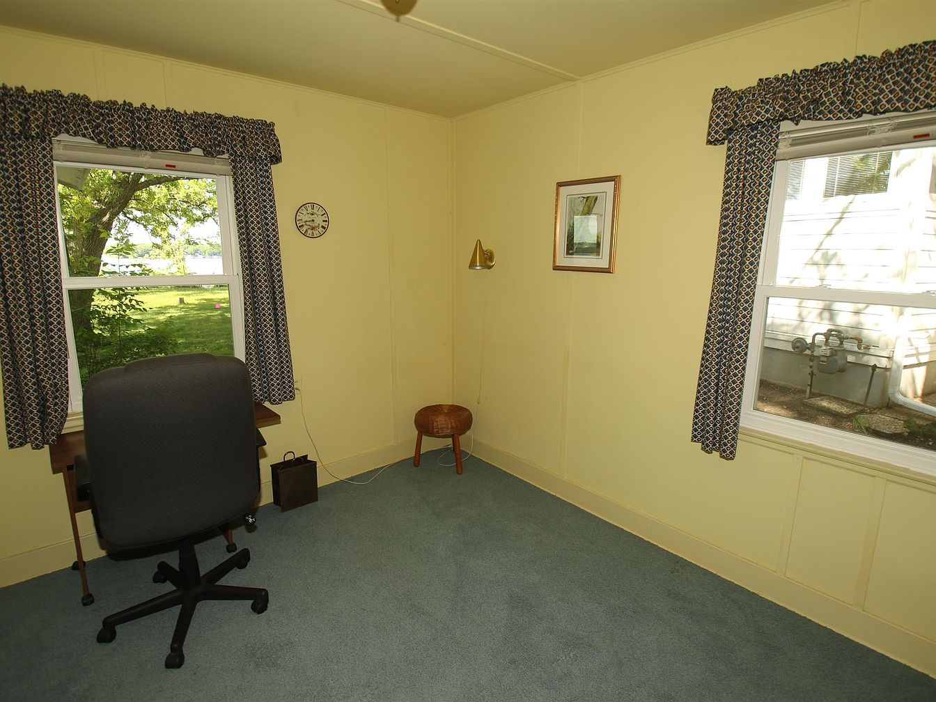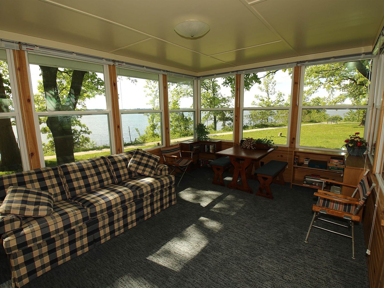 A sunroom filled with natural light from large windows that stretch across two sides of the space, providing expansive views of a lakeside landscape and lush green lawn. The room features a cozy checkered sofa in muted navy and beige tones, complemented by a pair of matching throw pillows. There is a square wooden table with two matching benches and folding chairs, ideal for games or casual dining. Built-in wooden shelves beneath the windows display books, games, and potted plants, adding a homey and inviting atmosphere. The carpet is a dark, textured gray, lending a comfortable and relaxed feel.