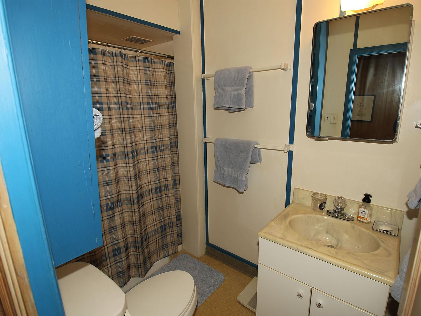 A compact bathroom with a beige and blue color palette. The vanity features a cream-colored marble countertop and white cabinet, topped with a glass soap dispenser and a couple of small personal items. Above the sink is a simple rectangular mirror with a single overhead light, casting a warm glow. Two towel racks on the wall hold neatly folded blue towels, which match the trim and cabinetry painted in bright blue. In the corner, a toilet sits beside a tub with a plaid-patterned shower curtain in shades of tan and blue, coordinating with the surrounding decor for a cohesive, vintage-inspired look.