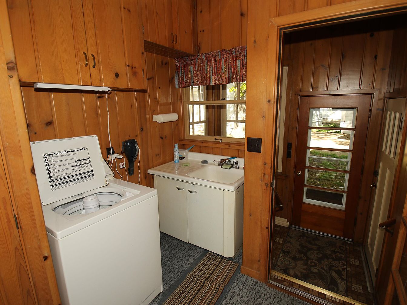 This room combines laundry functionality and a small entry space, featuring warm, honey-toned pine paneling that covers both walls and ceiling for a cozy, rustic aesthetic. The flooring consists of practical, neutral-toned carpeting with a narrow woven rug in front of a white, top-loading washing machine. A compact white utility sink with cabinet storage sits beneath a large, divided window dressed with a patterned valance. Overhead, simple built-in cabinetry offers ample storage. The adjacent doorway leads outside and features a vintage wooden door with horizontal glass panes, resting on a patterned doormat and bordered by more wood paneling.
