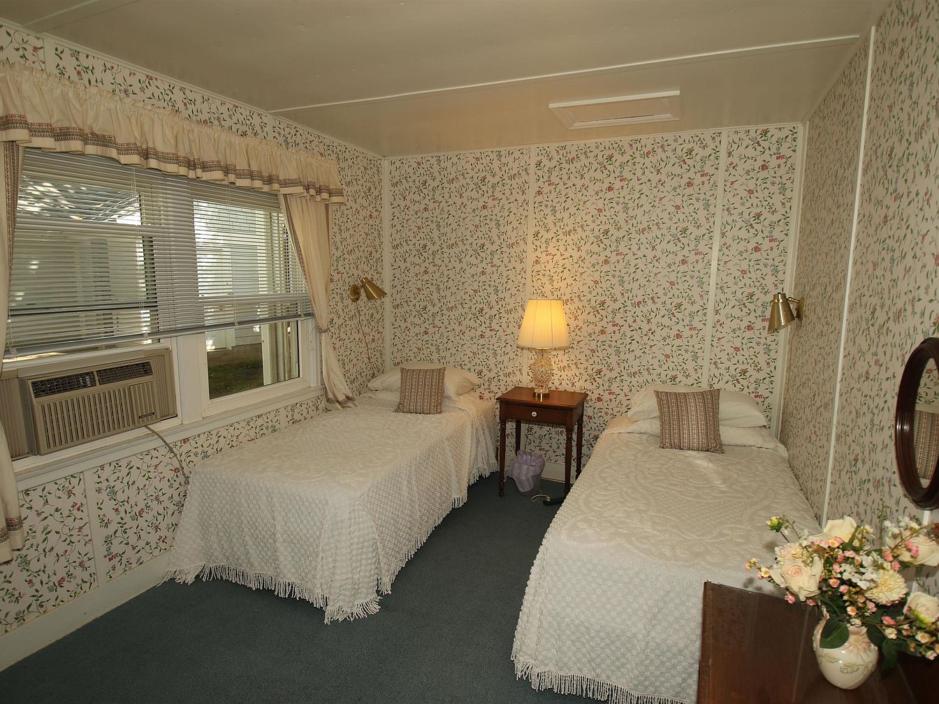 A modest bedroom with two single beds arranged parallel along the walls, separated by a small wooden nightstand topped with a classic lamp. The decor evokes a vintage charm with floral wallpaper featuring small pink and green blooms, and light cream curtains with ruffled valance framing a window with a built-in air conditioning unit. Both beds have white textured bedspreads and matching patterned pillows. On the right, a wooden dresser holds a vase of fresh flowers, while the brass-plated reading lights mounted above each bed highlight the room’s cozy ambiance. The carpet is muted teal, adding soft contrast.