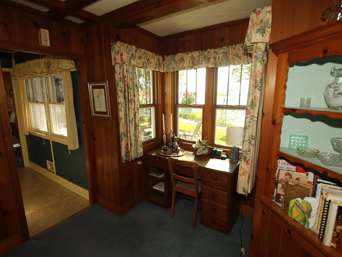 A cozy workspace tucked into a corner of the house, featuring a small wooden desk and chair beside a set of large windows. The windows are dressed with light floral curtains, letting in abundant natural light and offering a view of the garden outside. The walls, clad in warm wood paneling, create a rustic and inviting feel, complemented by a built-in wooden bookcase displaying cookbooks, glassware, and decorative items. The space includes an old-fashioned lamp, a couple of candlesticks, and a small decorative plant, giving the area a nostalgic, lived-in charm ideal for reading or quiet work.