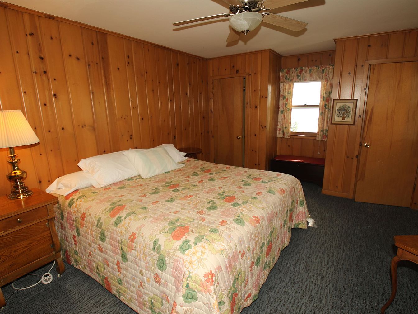 Warm knotty pine wood paneling covers all the walls, lending a rustic lodge feel to the room. A double bed with a pastel floral quilt and four white pillows sits against one wall, flanked by a classic wooden nightstand topped with a brass lamp. Across from the bed, a window brings in daylight, framed by floral curtains that echo the bedspread. Two wooden doors are visible, likely leading to a closet and another room. A ceiling fan with a light fixture is centered above, and the carpet is a muted blue-gray, providing a cozy, vintage atmosphere.