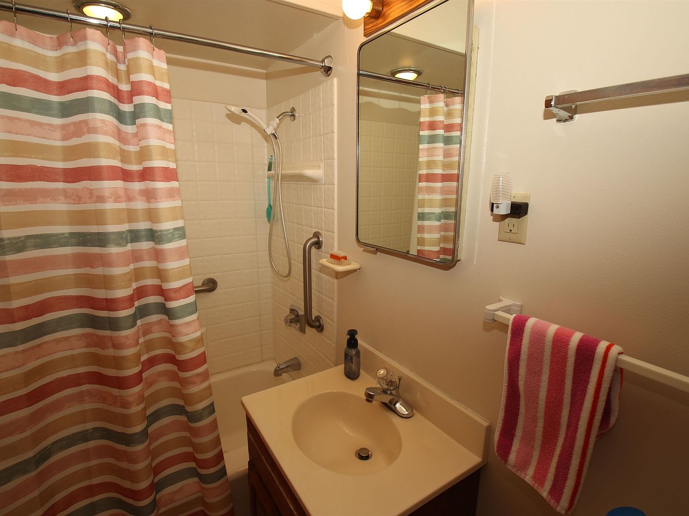 Compact bathroom with a cream-colored vanity and off-white sink. Above the sink is a rectangular mirror with a wooden trim and a single globe light fixture. The walls are painted a soft beige. The shower-tub combo features off-white tile and is enclosed with a striped shower curtain in pastel shades of pink, green, tan, and white. Grab bars are mounted inside the tub for extra support. A towel rack on the right holds a pink and white striped towel, echoing the shower curtain’s colors. Small accessories like soap, hand wash, and an air freshener add functional charm.