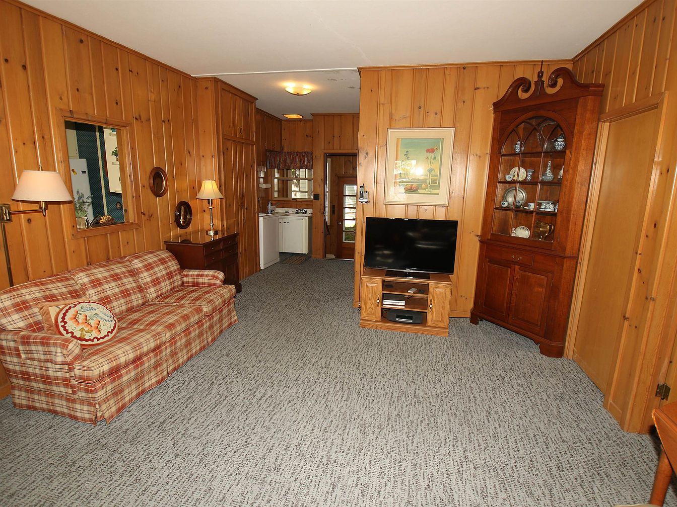 Warm wood paneling covers the walls from floor to ceiling, creating a cozy, rustic atmosphere. A plaid sofa in red and beige tones sits to the left, adorned with an embroidered accent pillow. The carpet is a neutral tone with a subtle, woven pattern. A traditional wooden china cabinet houses porcelain dishes and collectibles, adding to the historic charm. On the right wall, a flat-screen TV sits atop a small wooden stand. Soft lighting from a table lamp and wall lamp enhances the welcoming feeling. Small framed pictures and plates punctuate the decor, contributing to the room’s vintage, homey vibe.