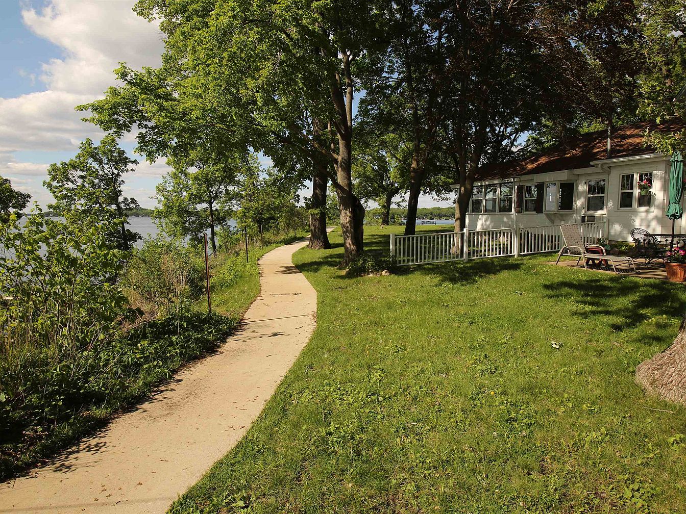 A peaceful garden area stretches along the side of the house, bordered by a meandering cement pathway that follows the water’s edge. Lush green grass covers the ground, with tall, mature trees casting soft shade across the yard. The white exterior of the house features large windows and an open porch framed by a white railing. Outdoor lounge chairs and a patio set, including a table with a green umbrella, offer inviting spaces to relax. The overall ambiance is serene, combining natural lake views, vibrant landscaping, and simple, classic country home architecture.