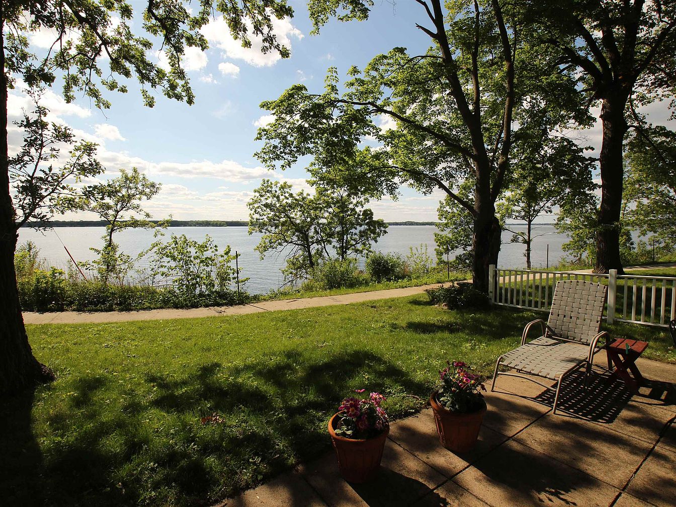 A shaded patio with a lake view, the foreground featuring two woven lounge chairs and a small wooden side table set on light concrete pavers. Two potted plants with blooming flowers accentuate the relaxed ambiance. Beyond a low white fence, lush green grass extends towards a walkway and further to mature trees that frame the expansive lake. Natural sunlight filters through the foliage, casting gentle shadows on the lawn and patio, creating a tranquil, inviting environment perfect for enjoying scenic water views and the beauty of the surrounding landscape on a bright, clear day.