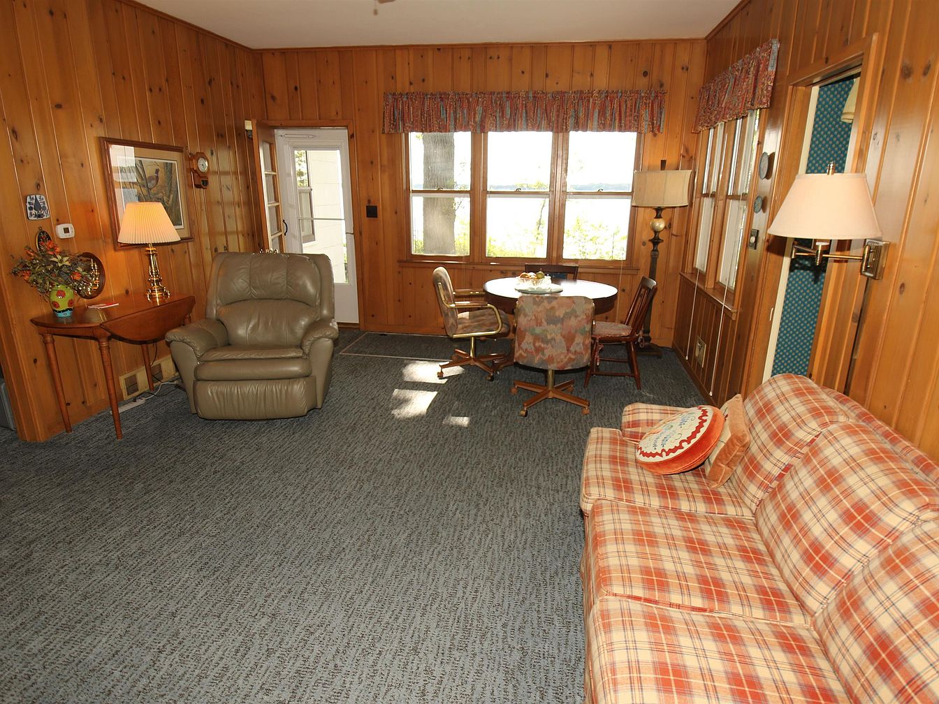 A cozy living room with wood-paneled walls, giving the space a rustic, cabin-like atmosphere. The carpet is a muted blue-gray tone, complementing the warm brown wood. On the left, an overstuffed leather armchair sits next to a wooden side table topped with a lamp and decorative items. A large window and a glass door allow natural light to fill the room. Against one wall is a plaid-patterned sofa in shades of orange and beige, accented with patterned pillows. Towards the back, a small round dining table with an eclectic mix of vintage chairs creates a casual, homey ambiance.